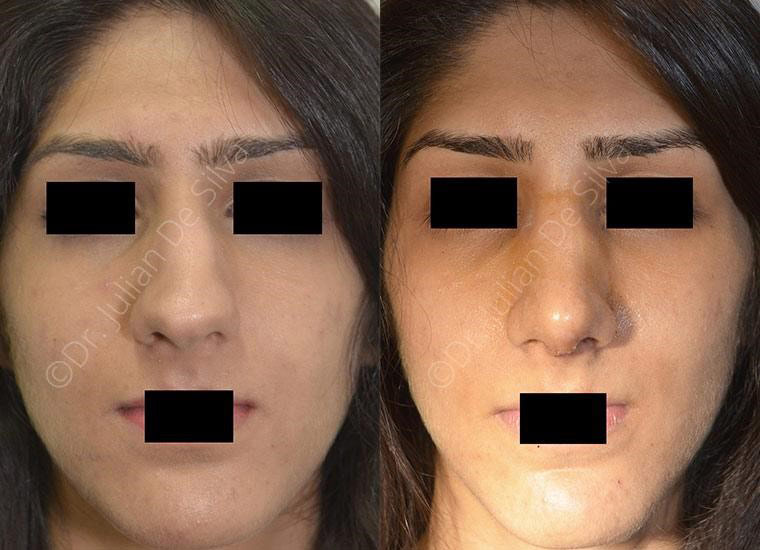 I, Dr. Julian De Silva used twilight anaesthesia to do ethnic rhinoplasty with septoplasty. She recovered in 20 minutes and was able to leave the hospital less than half an hour later. The cast and fine stitches were removed after one week, and the images depict the outcome.