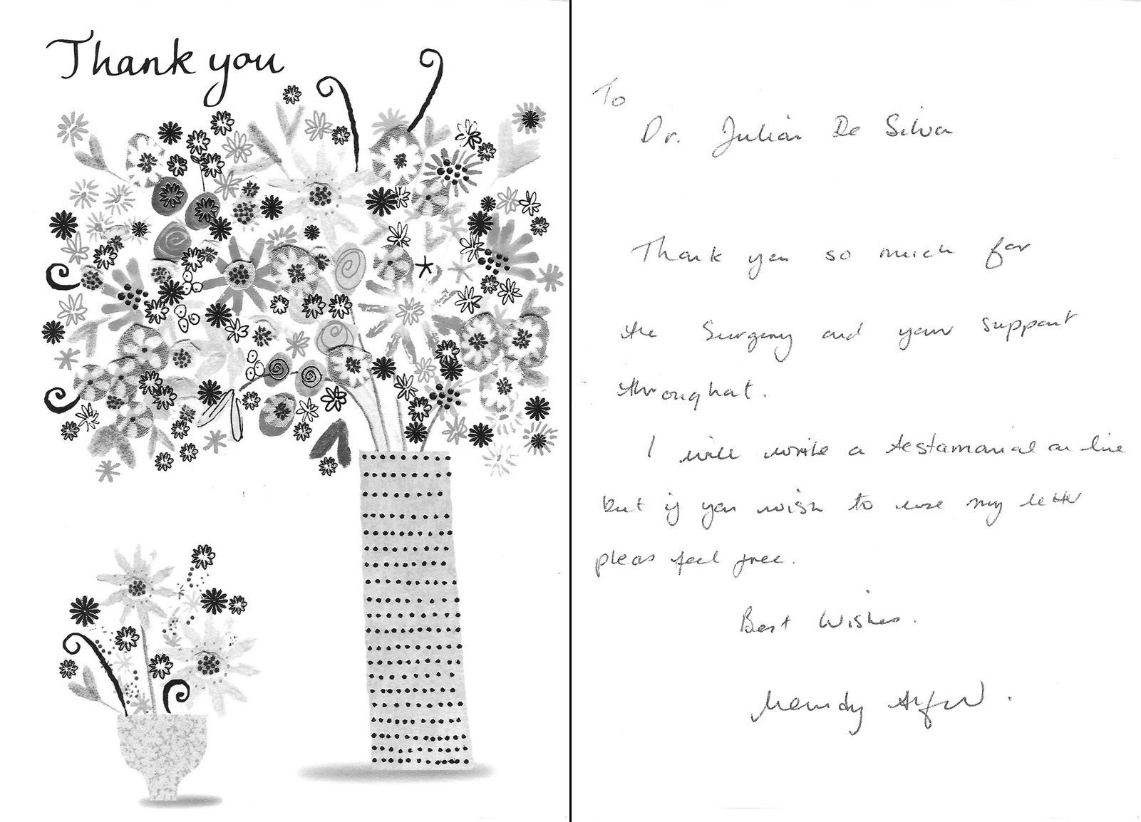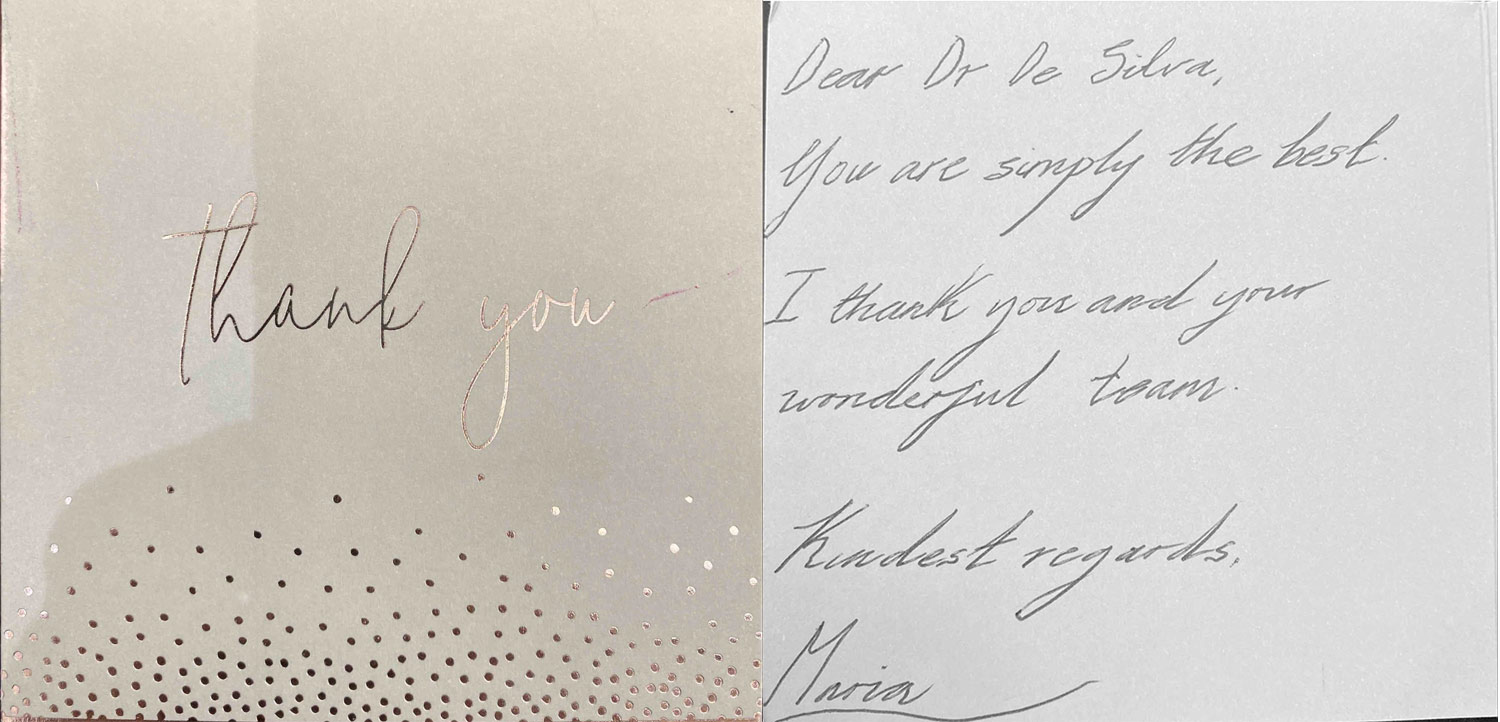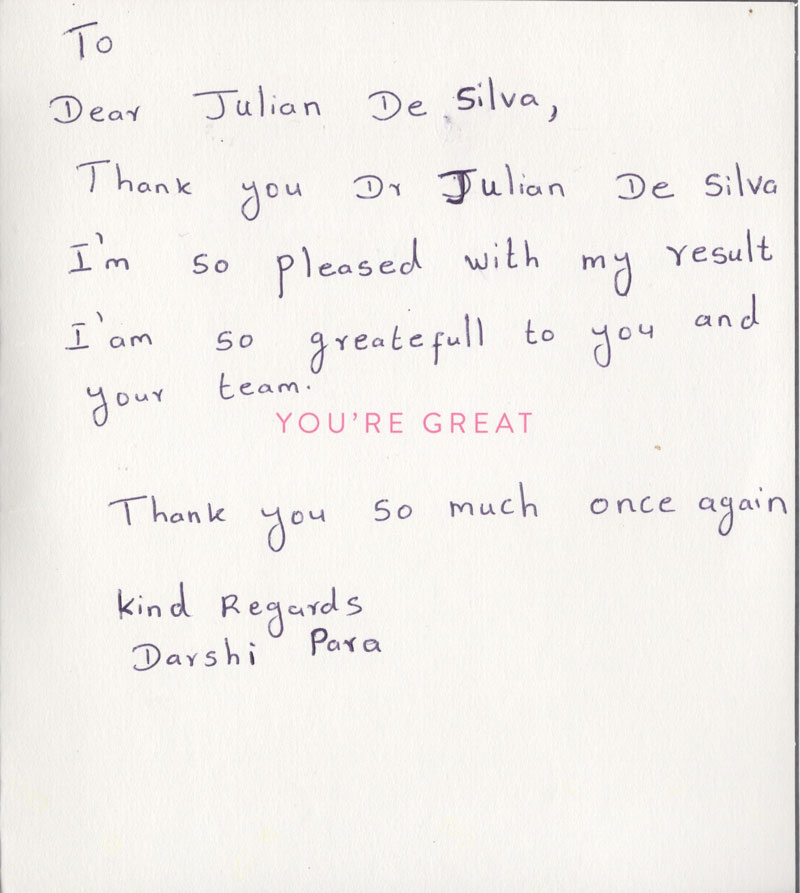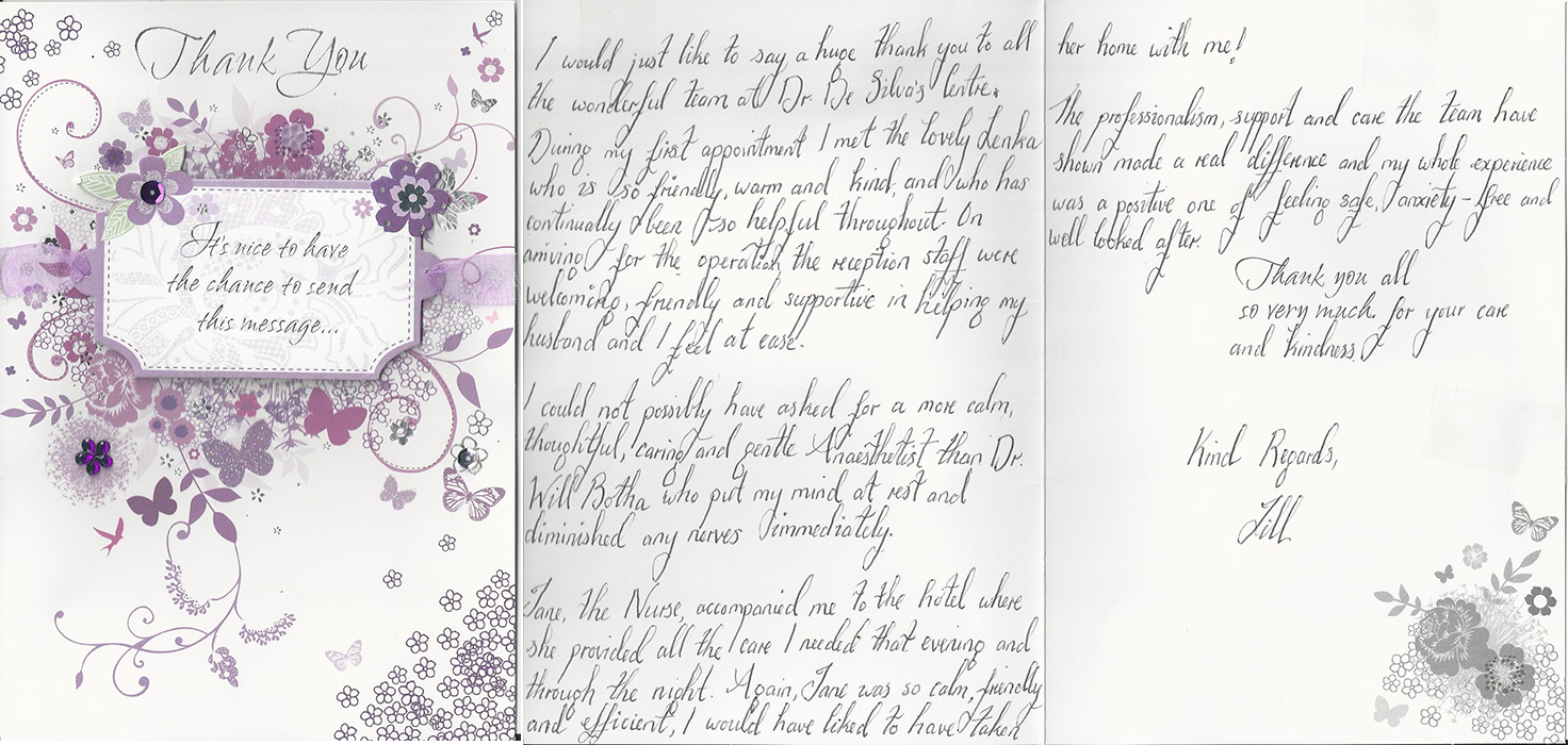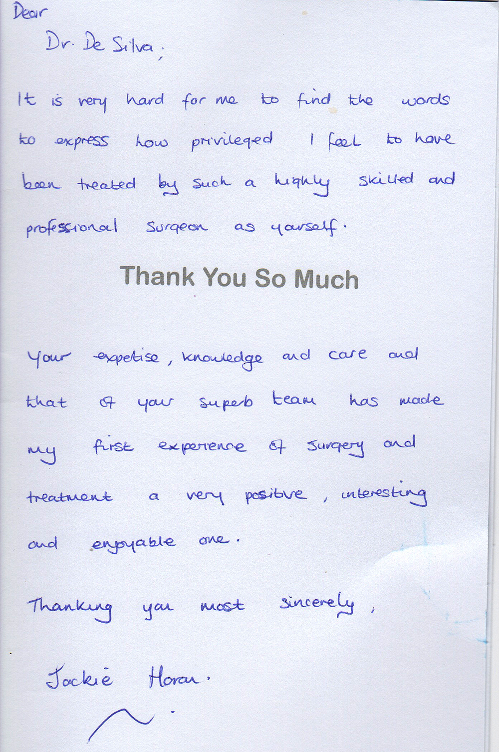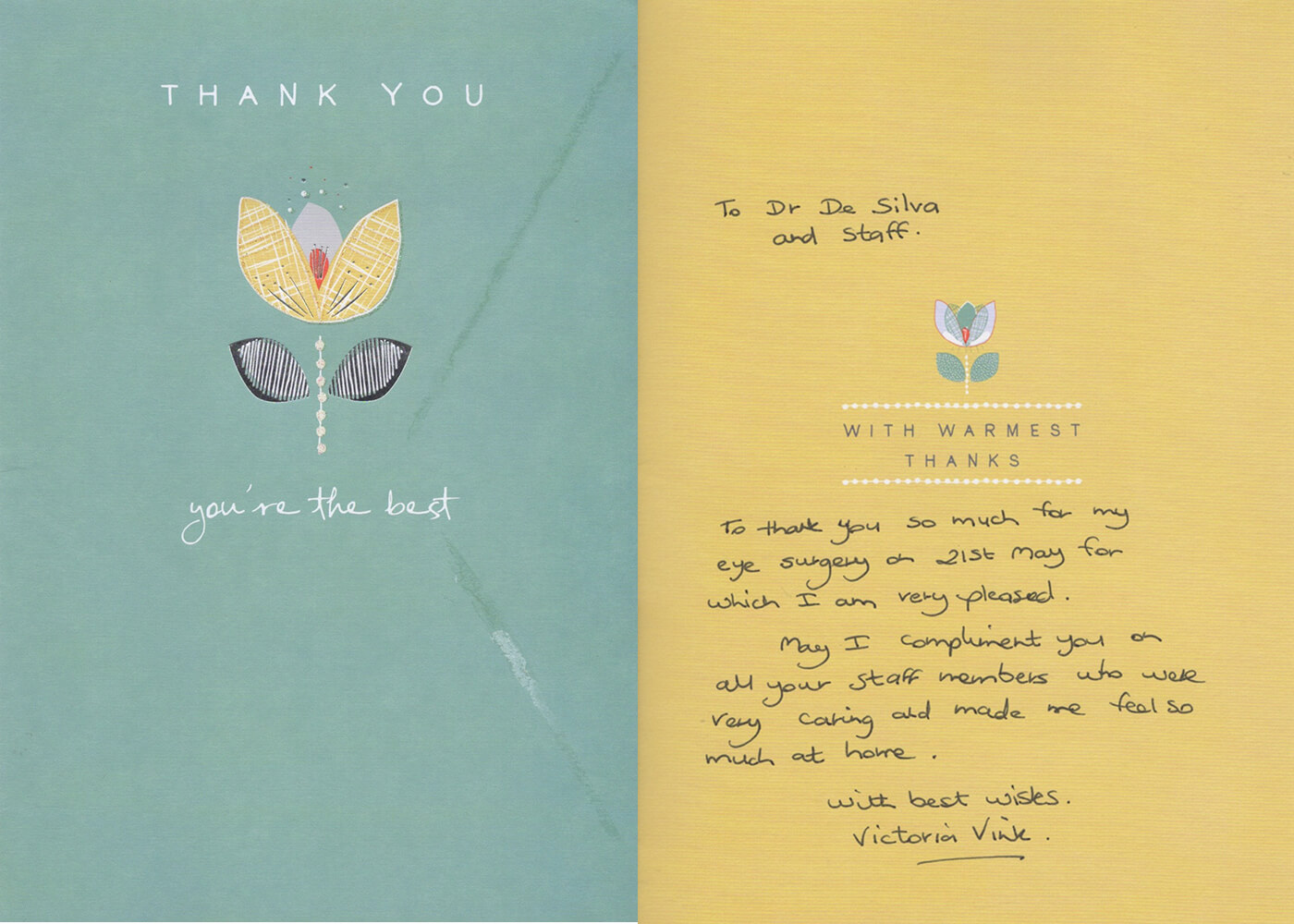 “I am writing to thank you for the way I was treated when I had my eye operation on the 25th July by Mr. Julian de Silva. He and his staff looked after me very well. The standard of treatment was very high, once again than you.”