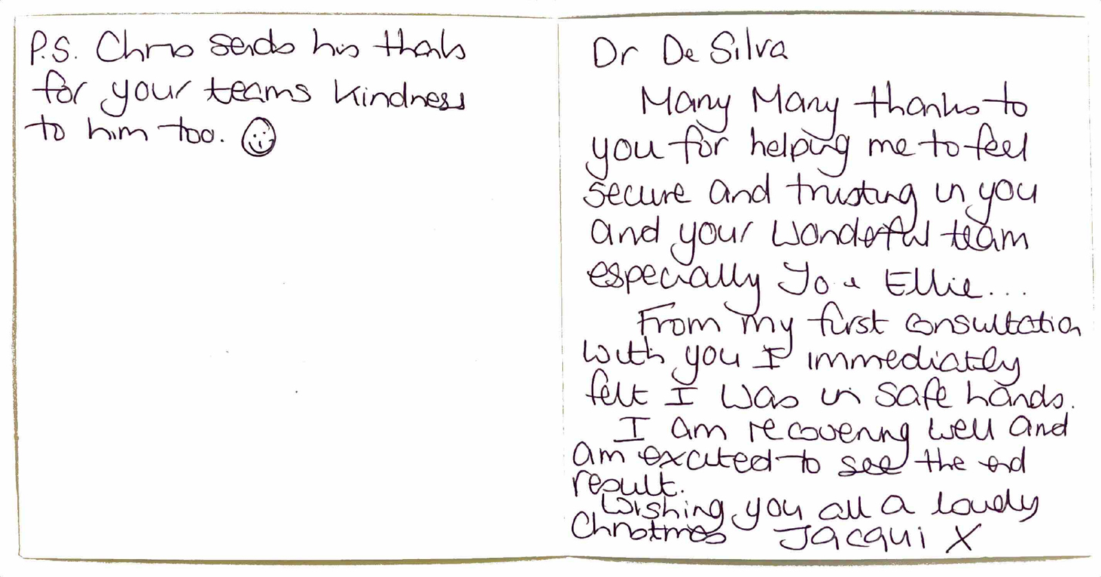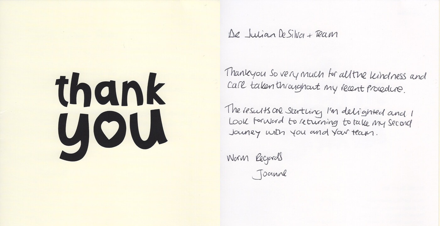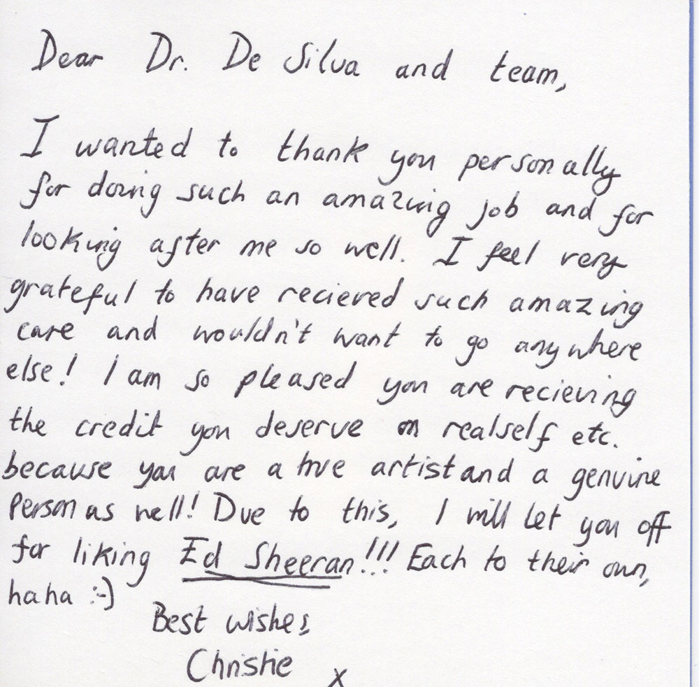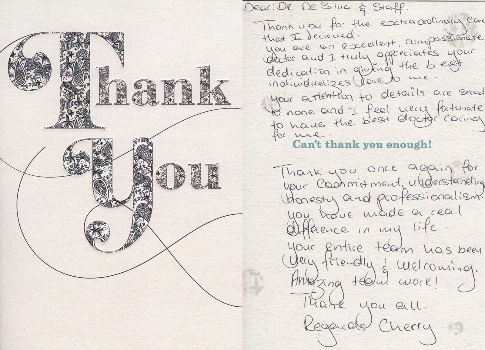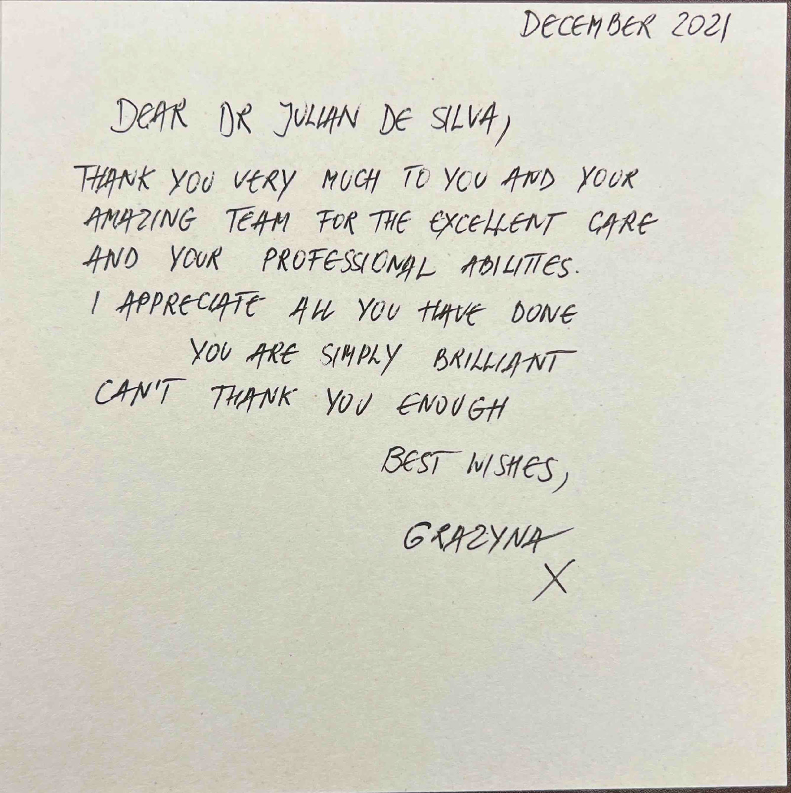 “I am writing to thank you for the way I was treated when I had my eye operation on the 25th July by Mr. Julian de Silva. He and his staff looked after me very well. The standard of treatment was very high, once again than you.”
