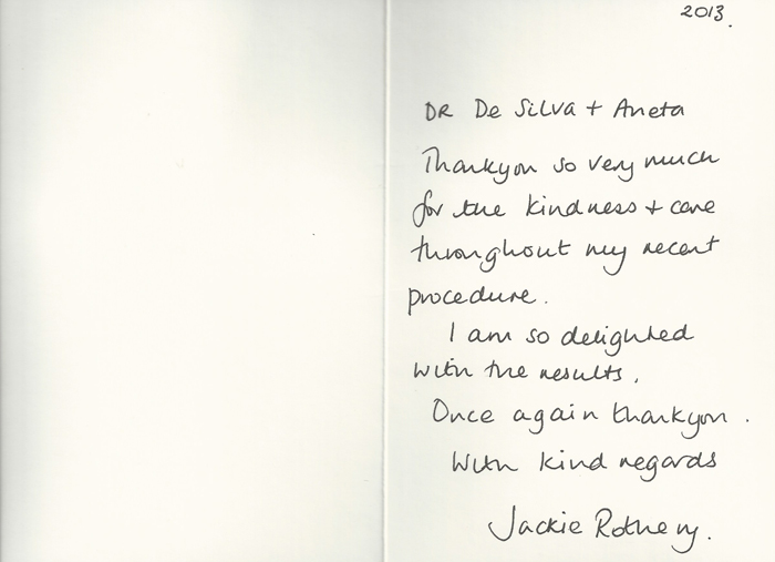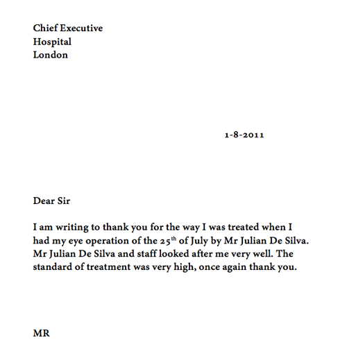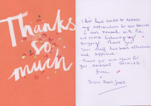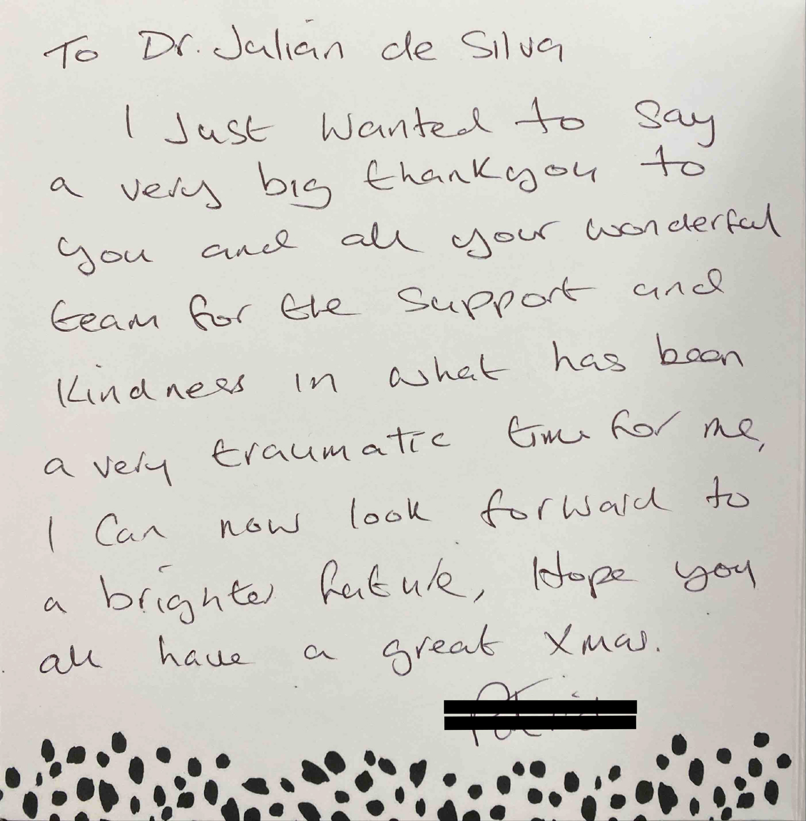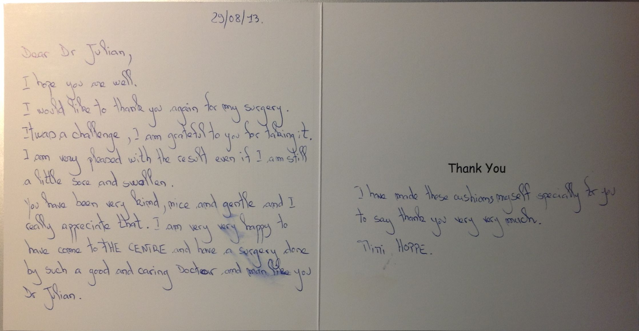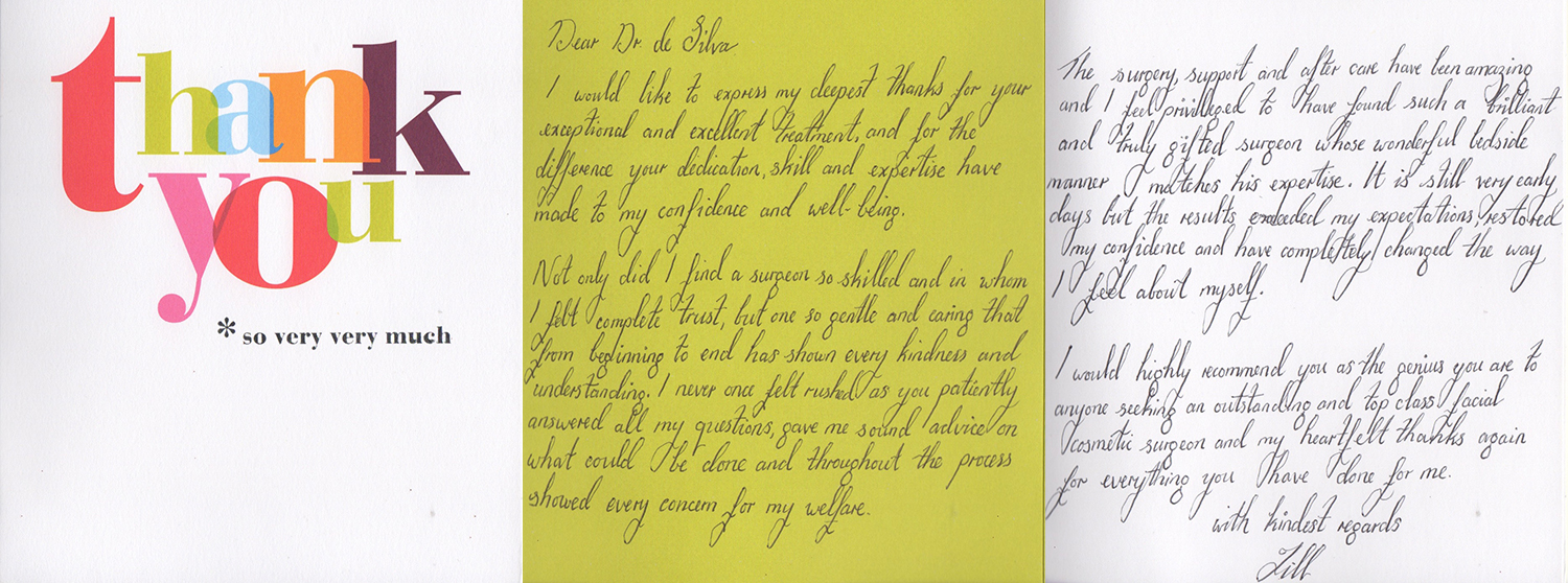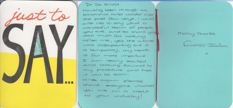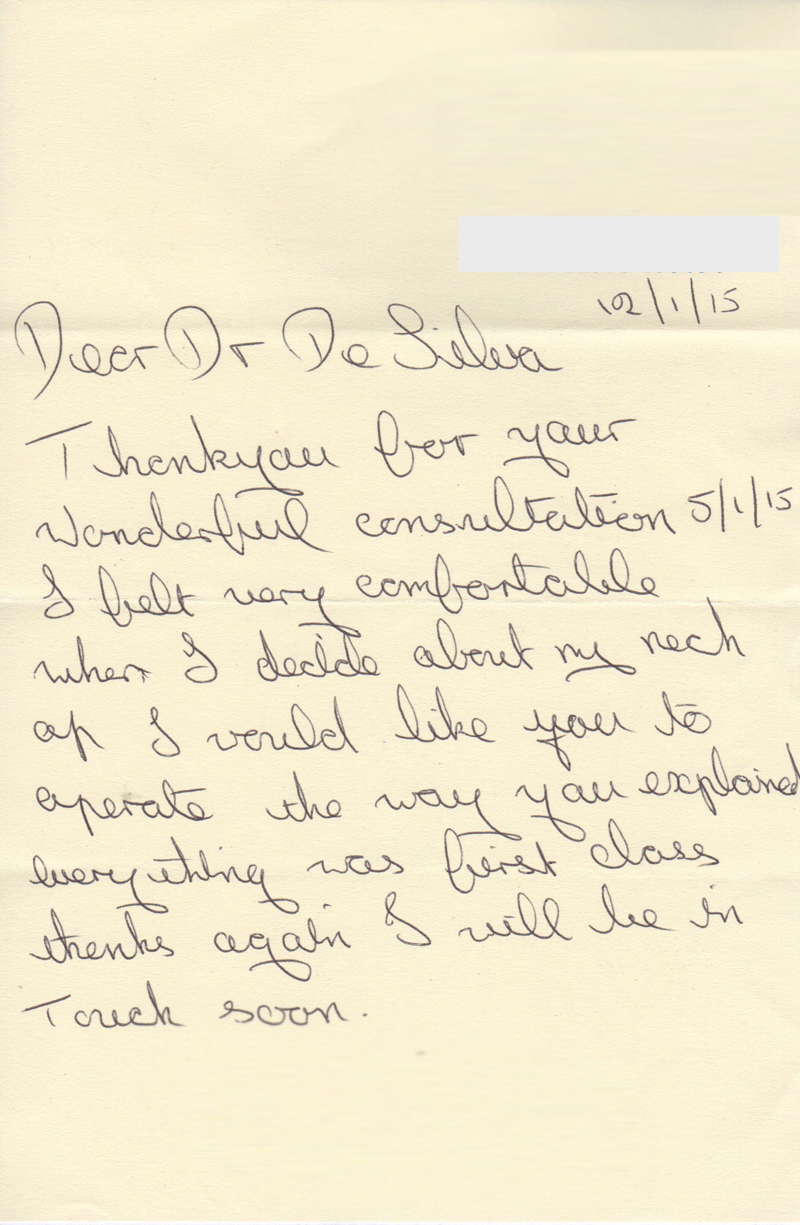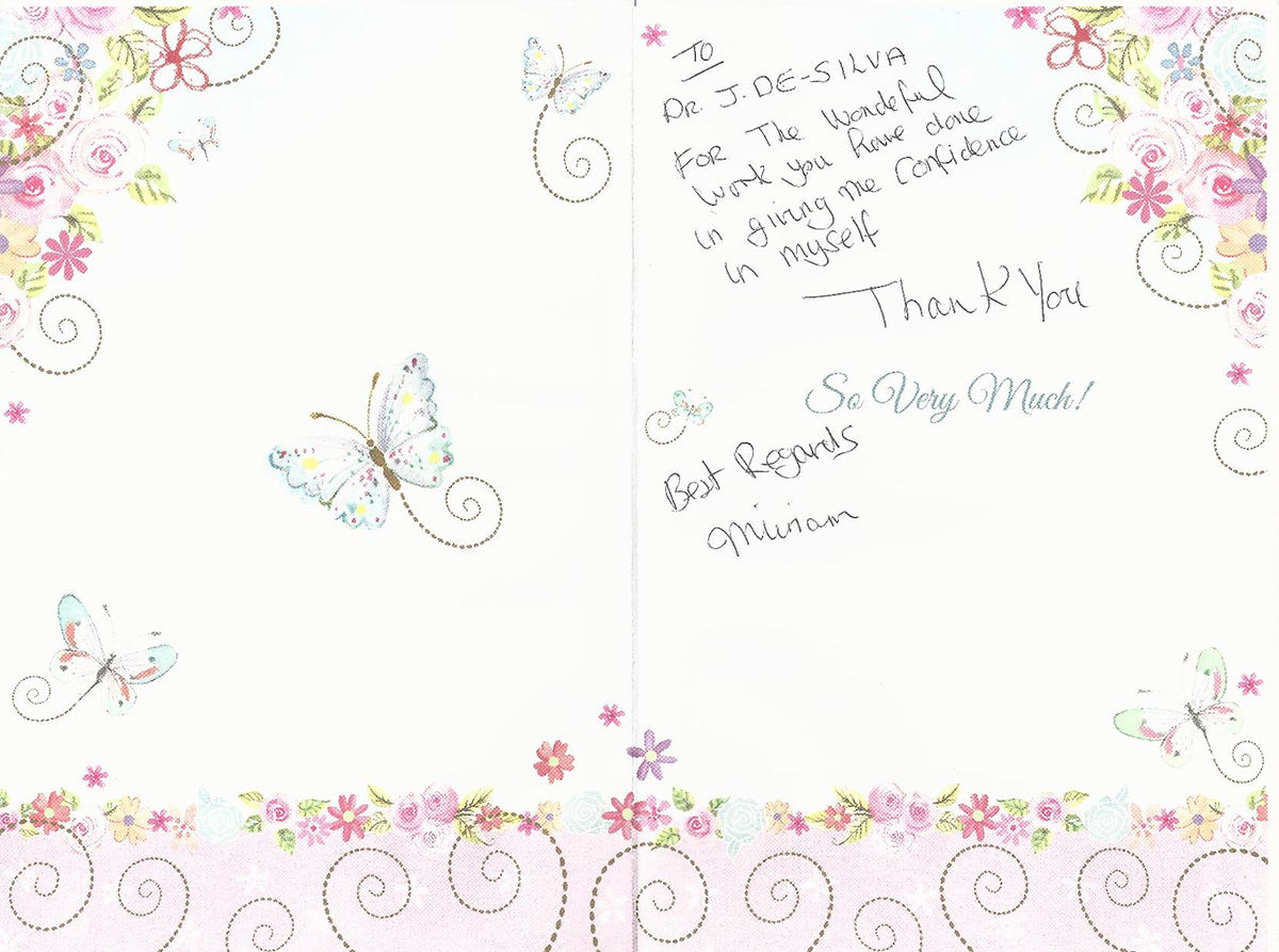 “I am writing to thank you for the way I was treated when I had my eye operation on the 25th July by Mr. Julian de Silva. He and his staff looked after me very well. The standard of treatment was very high, once again than you.”
