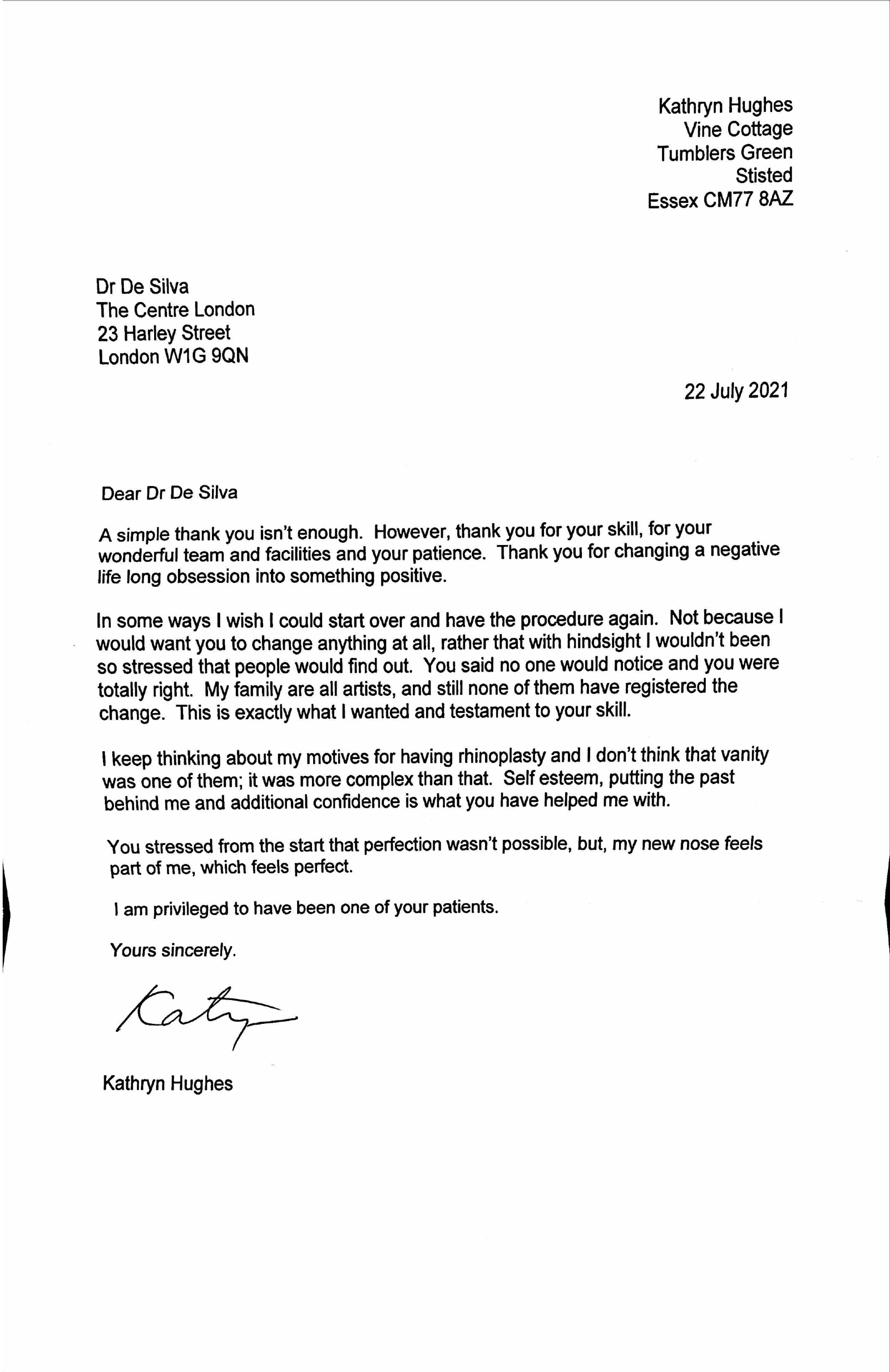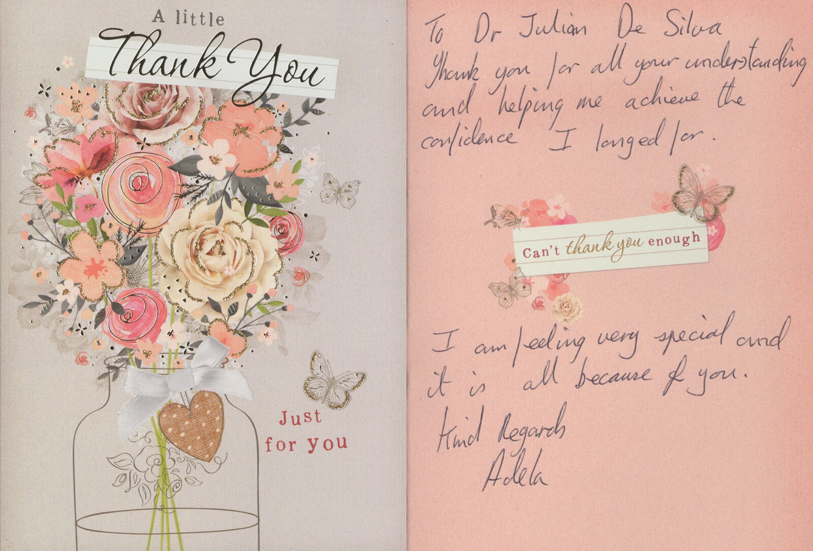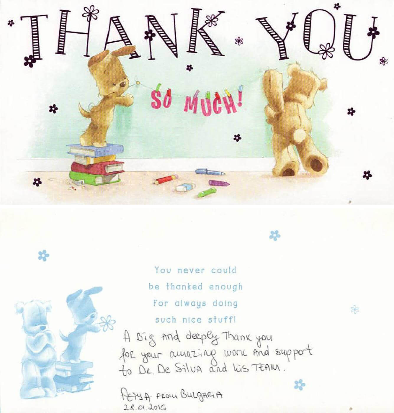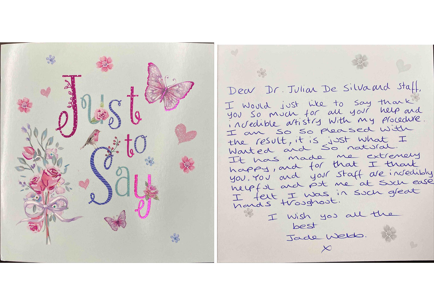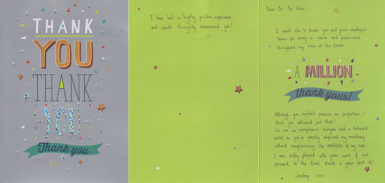 “I am writing to thank you for the way I was treated when I had my eye operation on the 25th July by Mr. Julian de Silva. He and his staff looked after me very well. The standard of treatment was very high, once again than you.”