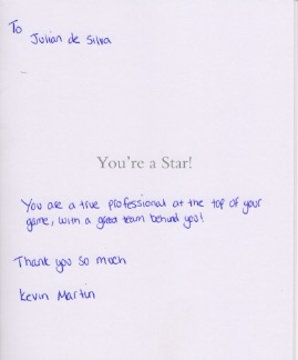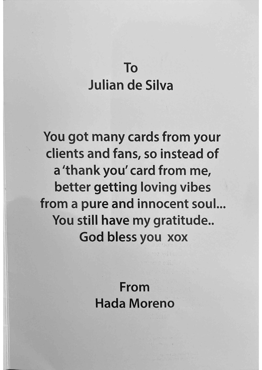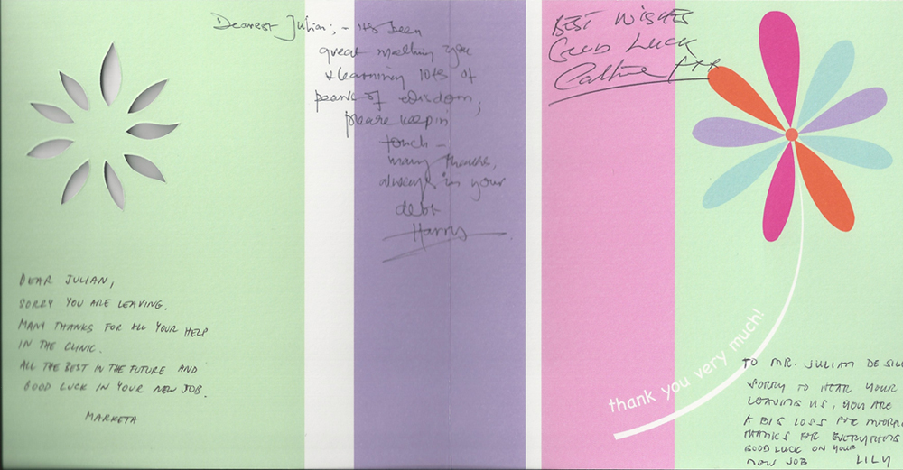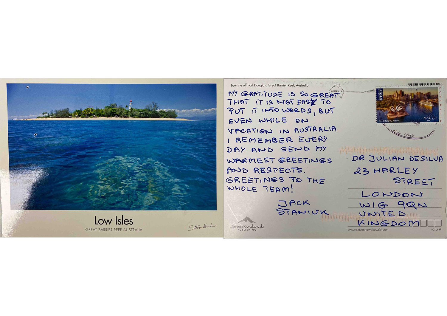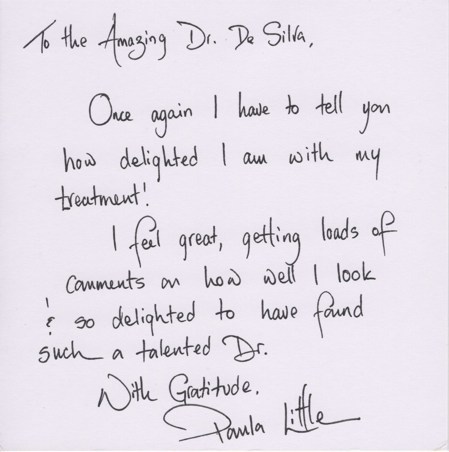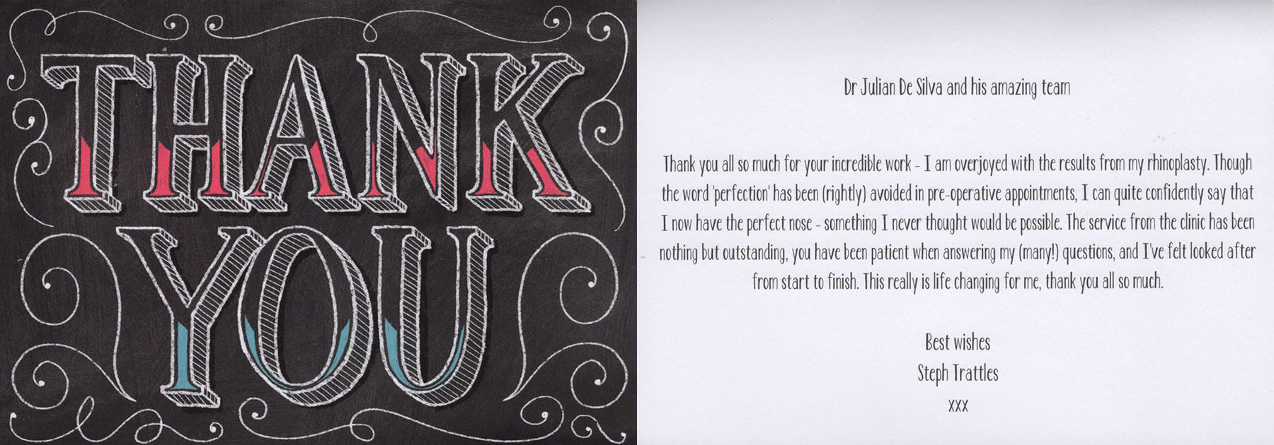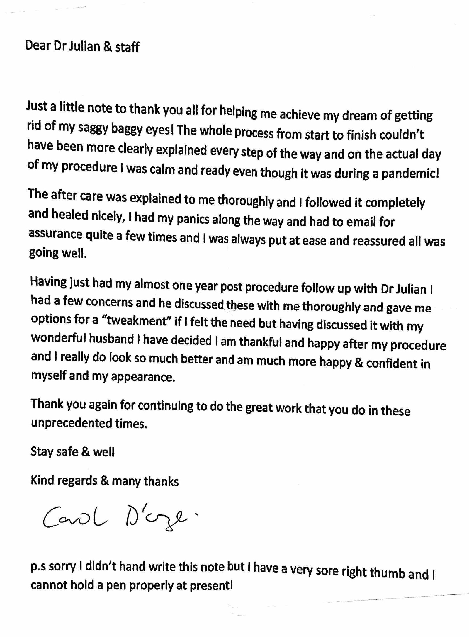 “I am writing to thank you for the way I was treated when I had my eye operation on the 25th July by Mr. Julian de Silva. He and his staff looked after me very well. The standard of treatment was very high, once again than you.”