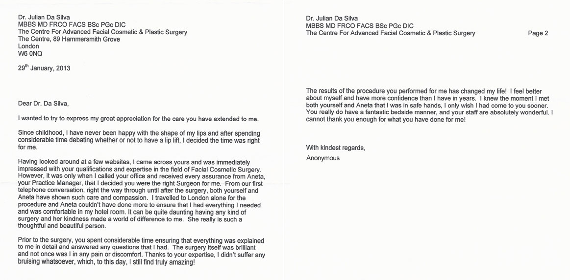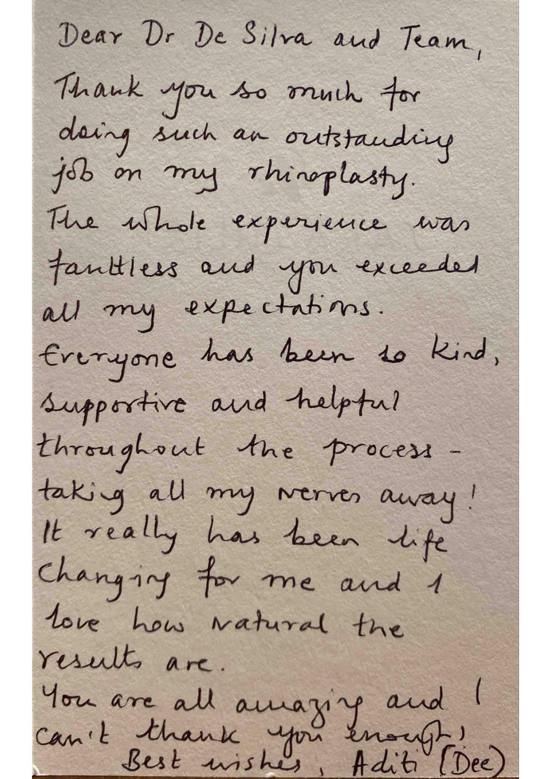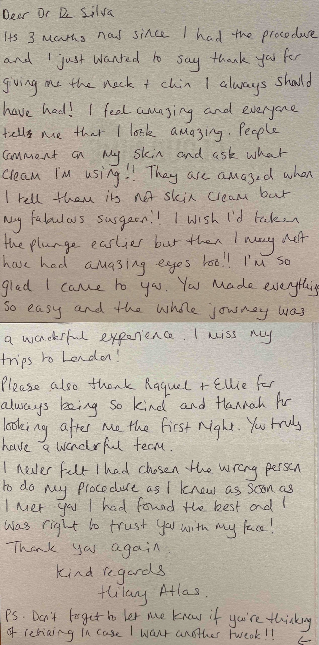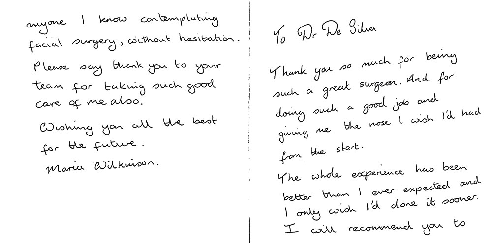I researched several other surgeons for this procedure but was impressed with Dr De Silva’s facial specialism and international experience and therefore it was an easy choice after my initial meeting.