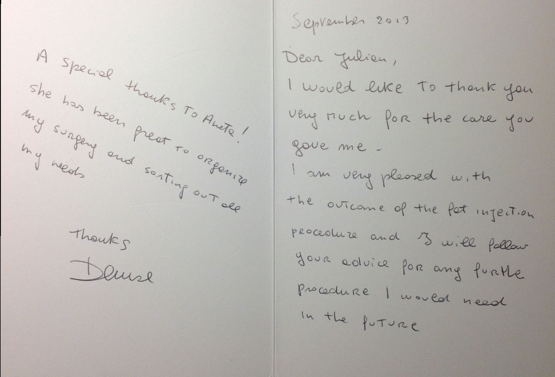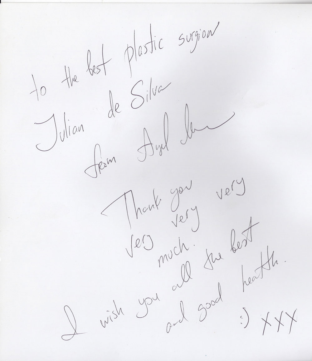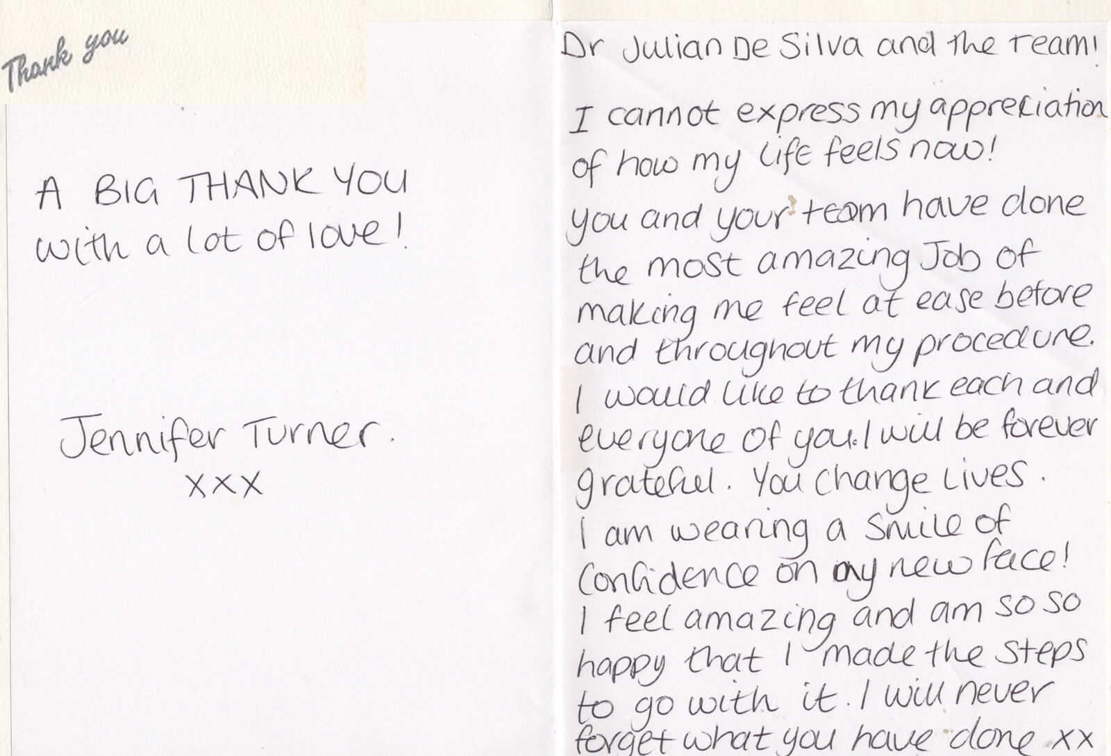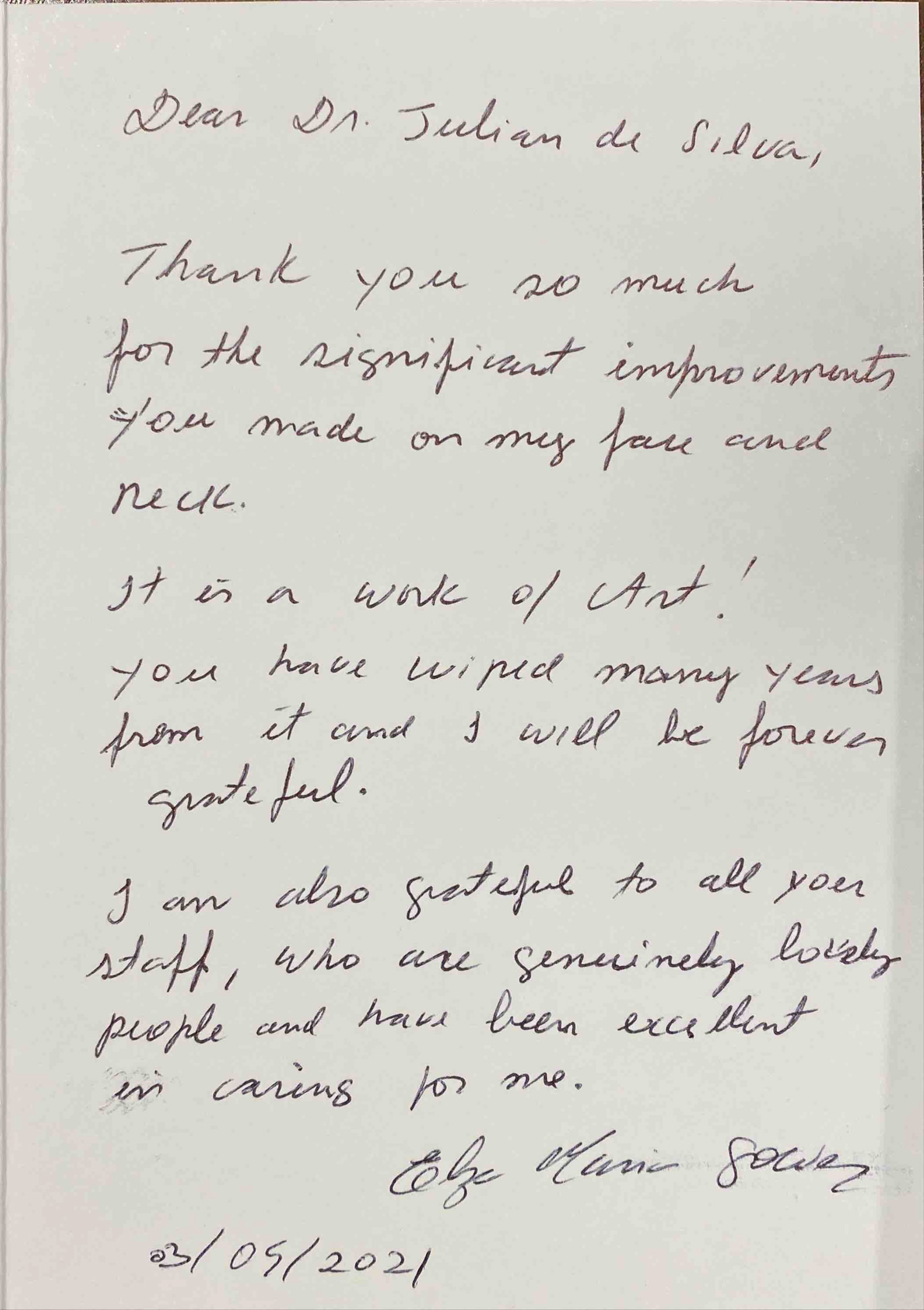 “Trop contente d\’avoir trouve\’ un chirurgien aussi bon que Dr Julian De Silva et sa belle equipe sympatique, professionnelle et attentionnee a\’ sa clinique The Centre. Je ne m\’attendais pas a\’ une si belle reussite de l\’operation. Jamais je ne remercierai assez Dr Julian,un homme si doux, si gentil, un excellent chirurgien . Thank you to everyone at The Centre, thank you sooo very much Dr Julian.”