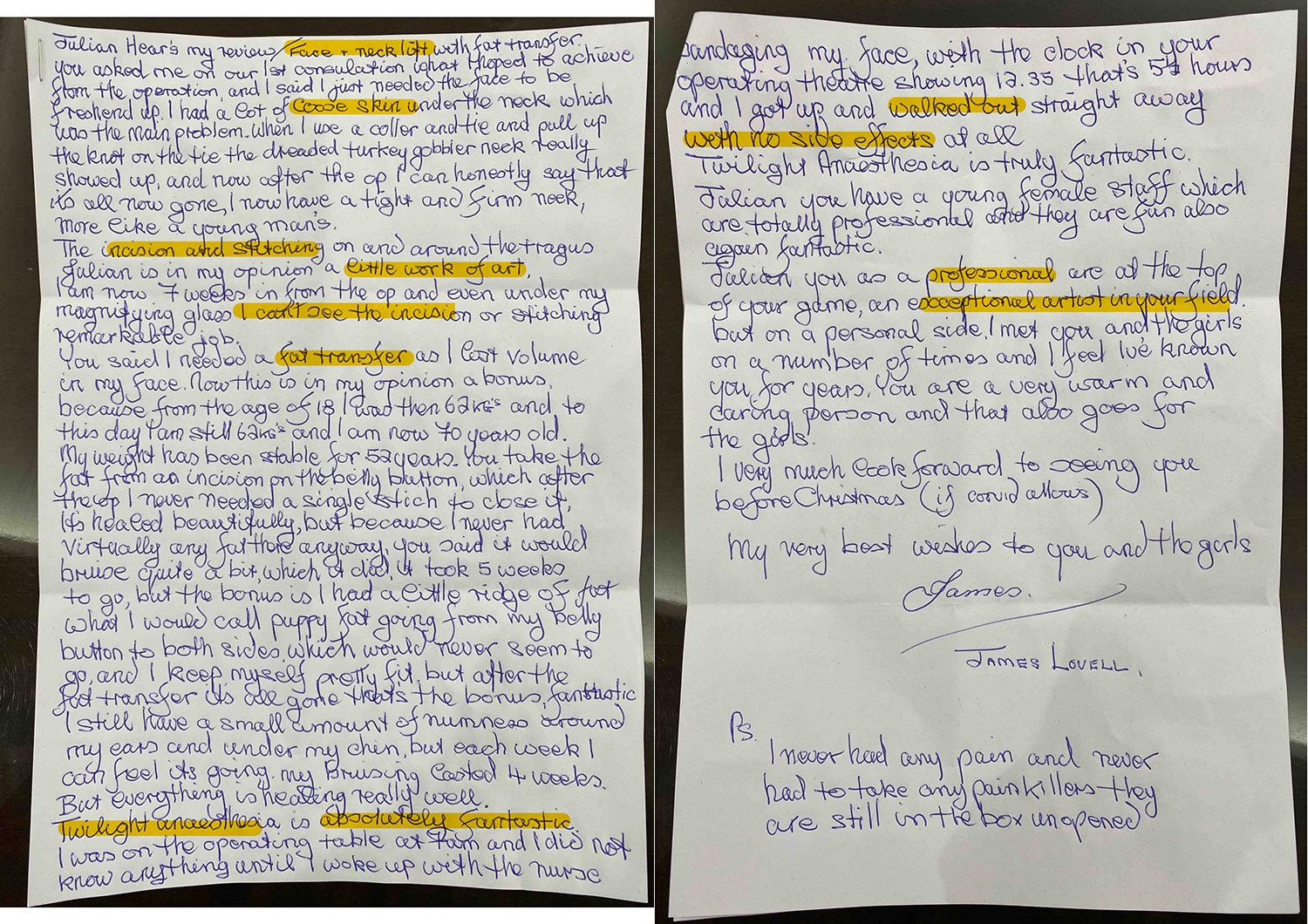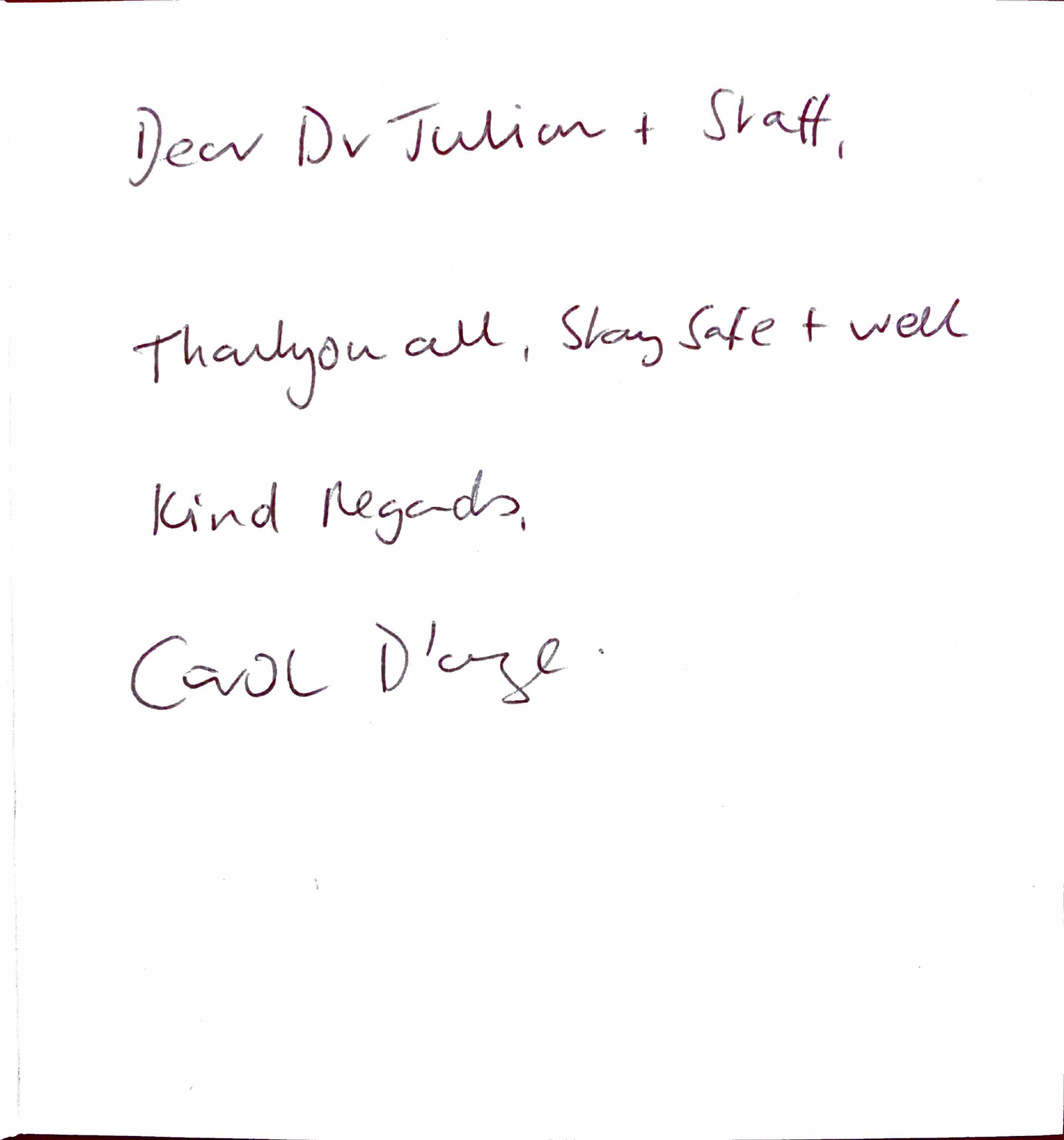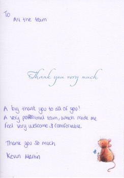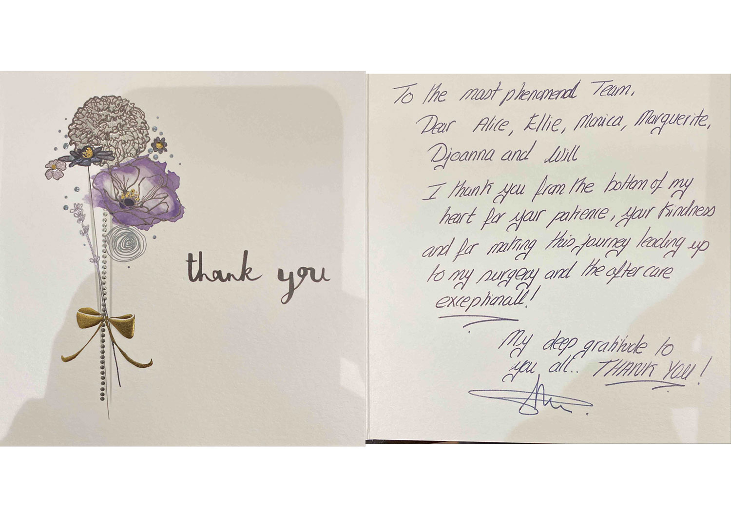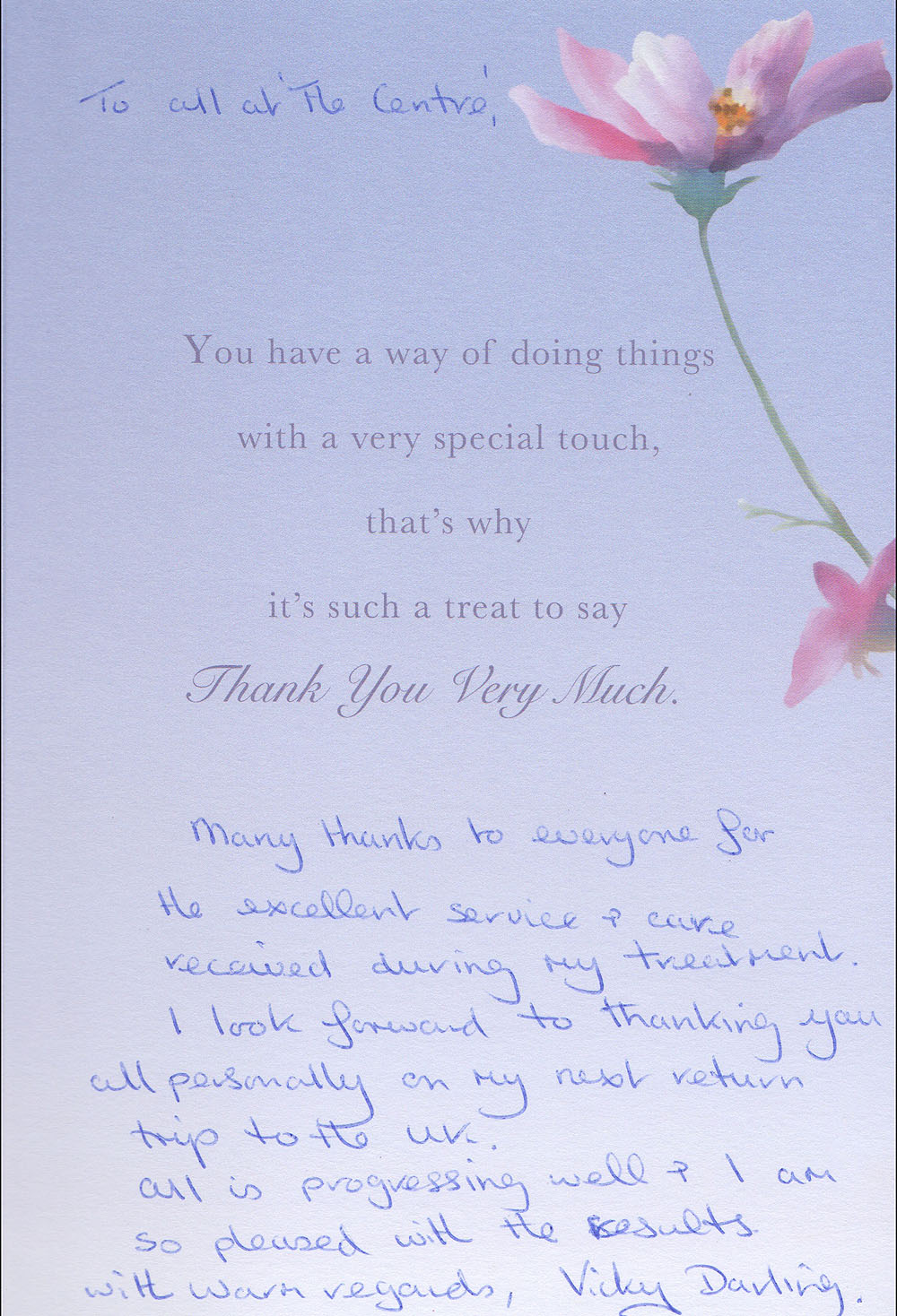 “Thank you for your professional service and kindness. You made the procedure a pleasant experience and I felt reassured and confident throughout. Many many thanks. Regards TL”