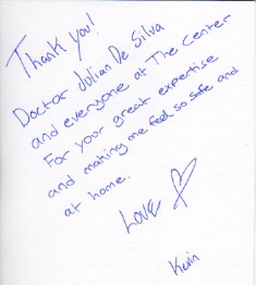 “Dr B. Thank you for your very thorough review and I feel You covered and anticipated all questions. Of greatest importance, thank You for your immense compassion, warmth and concern for my comfort. It meant more to me during the first hour after surgery than you can imagine. I felt miserable and in pain and foolish. You eased all that for me.”