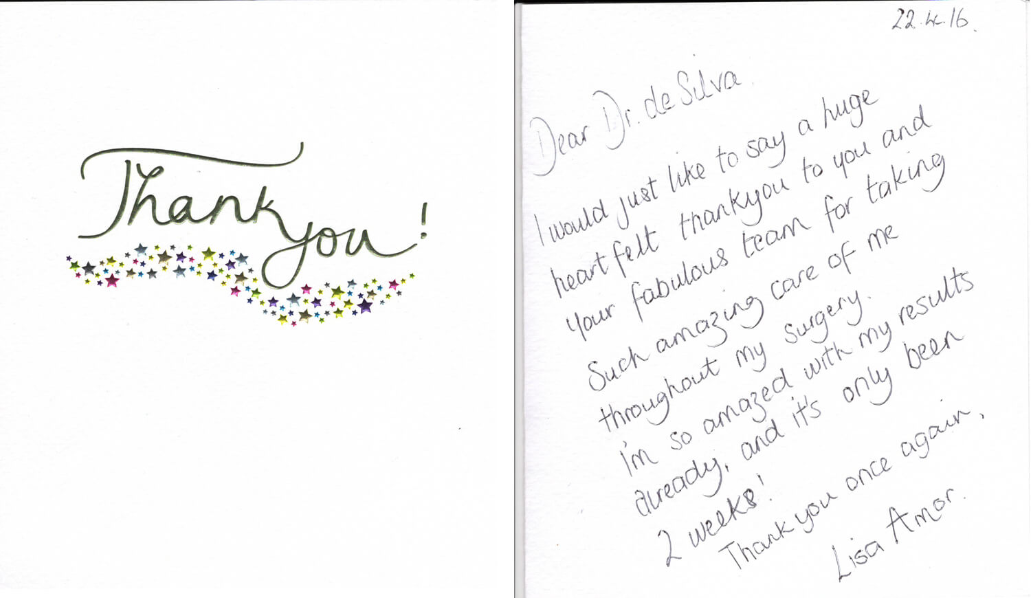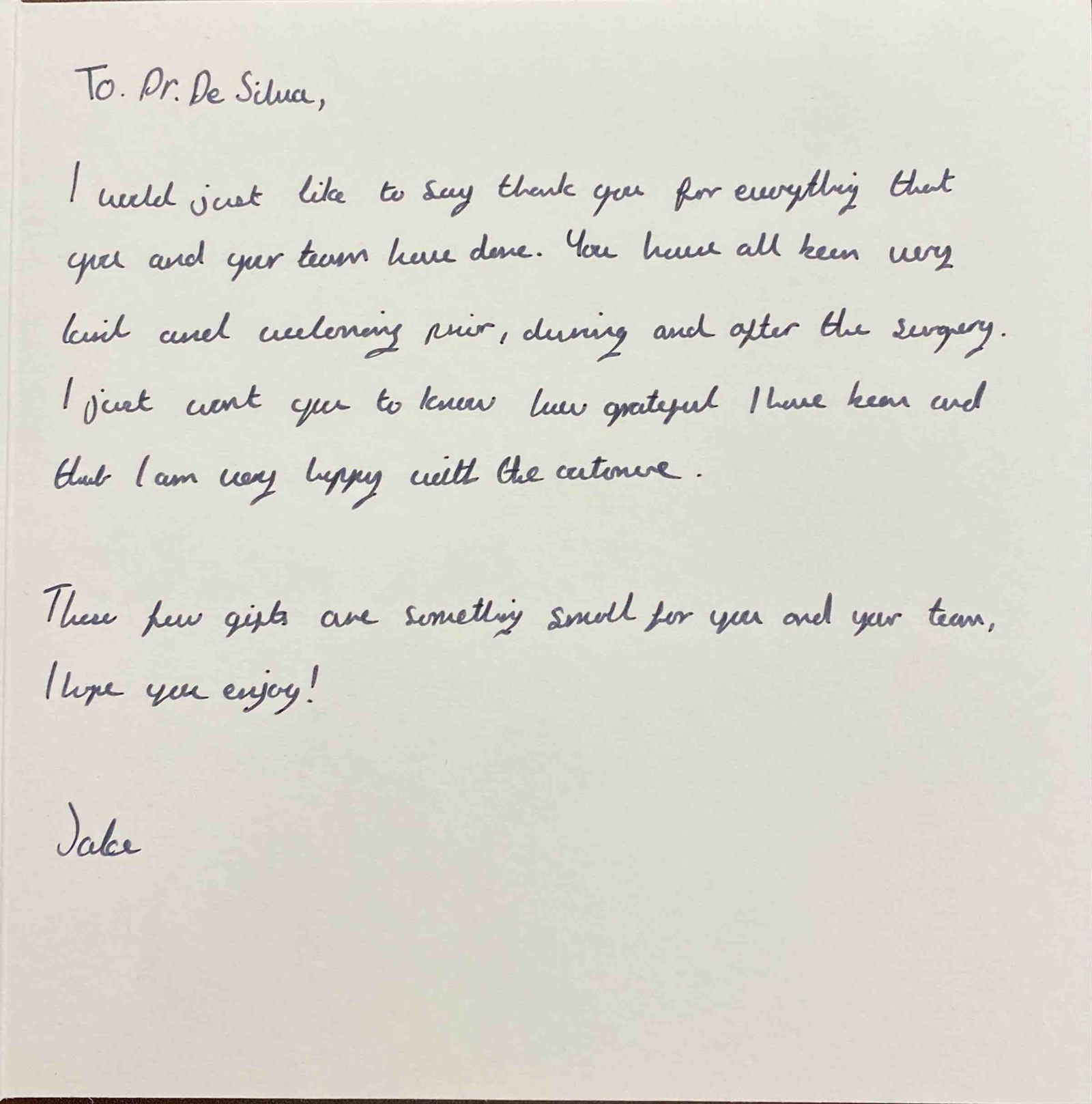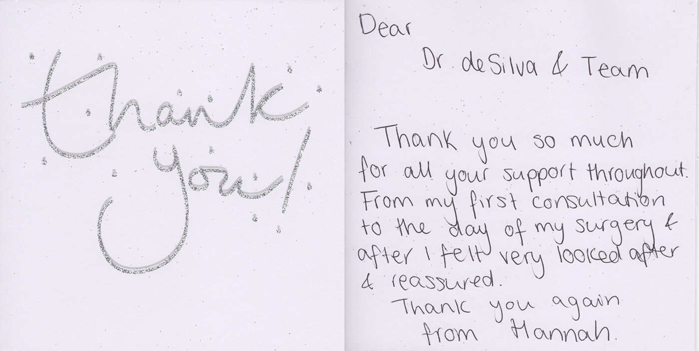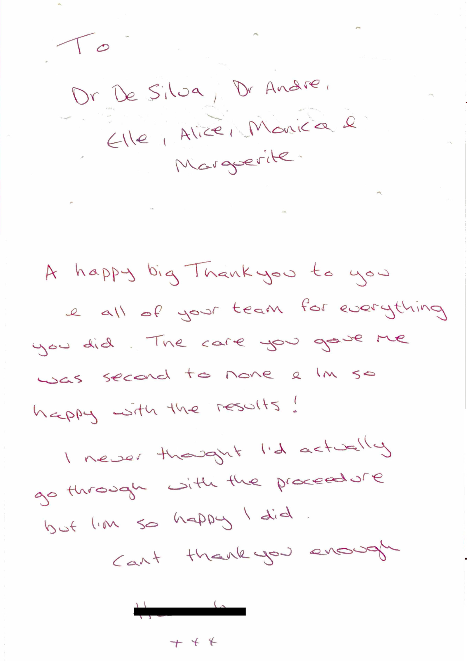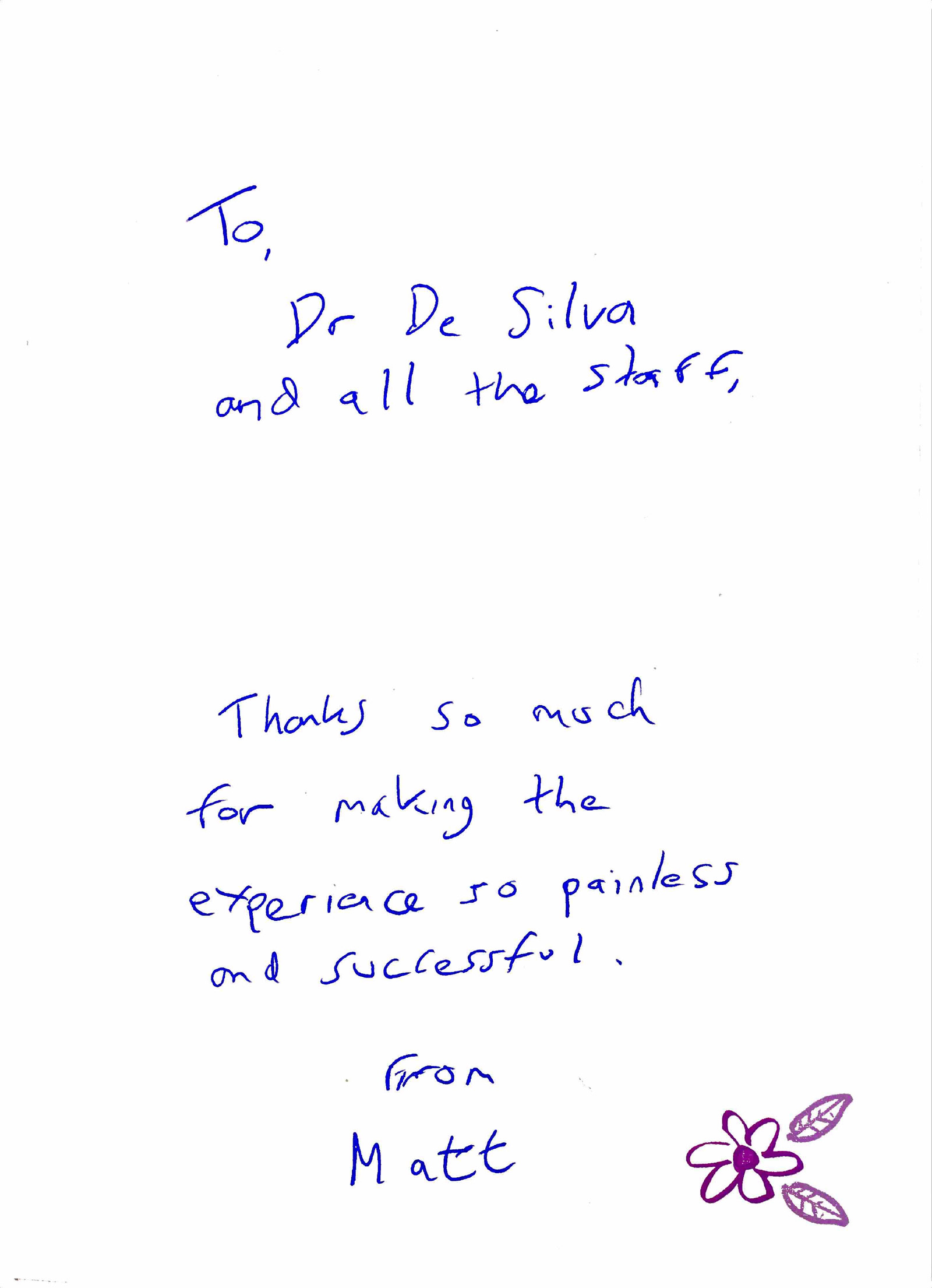 “I was very impressed with Dr De Silva’s surgical and anaesthetic care, thank you.”