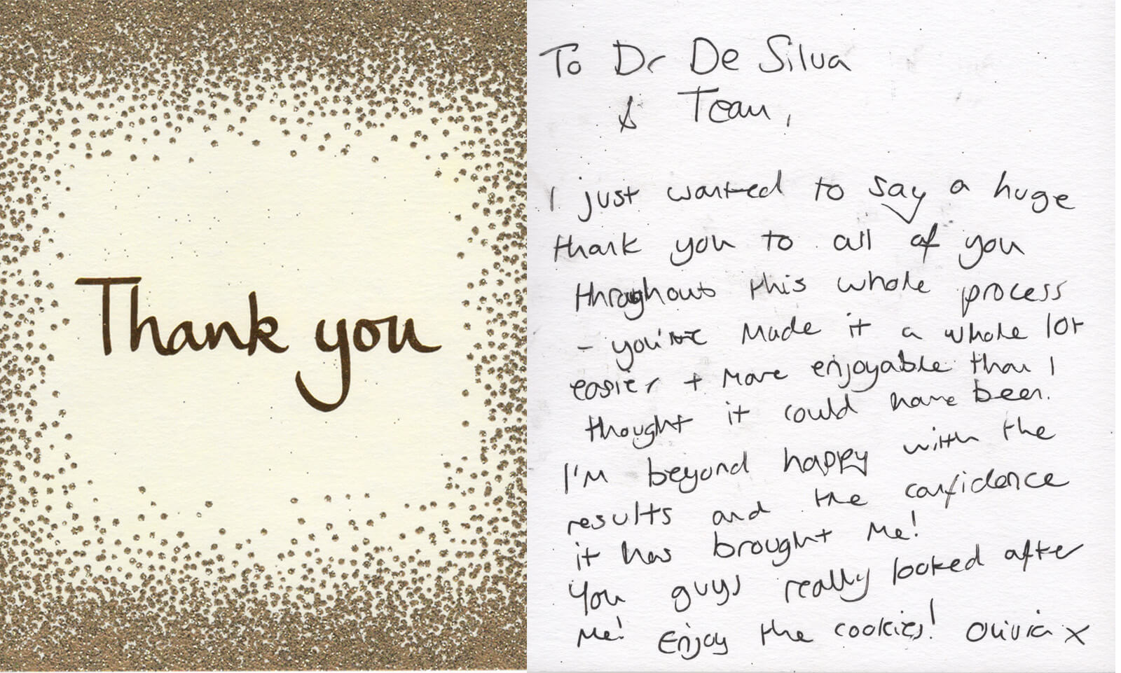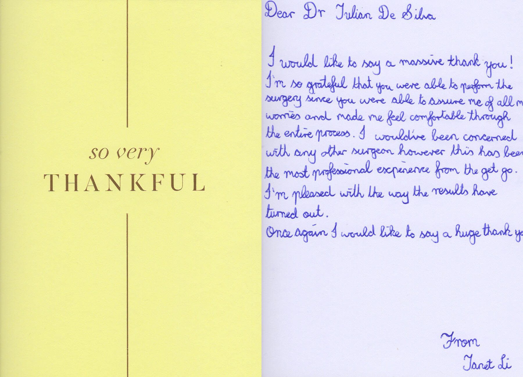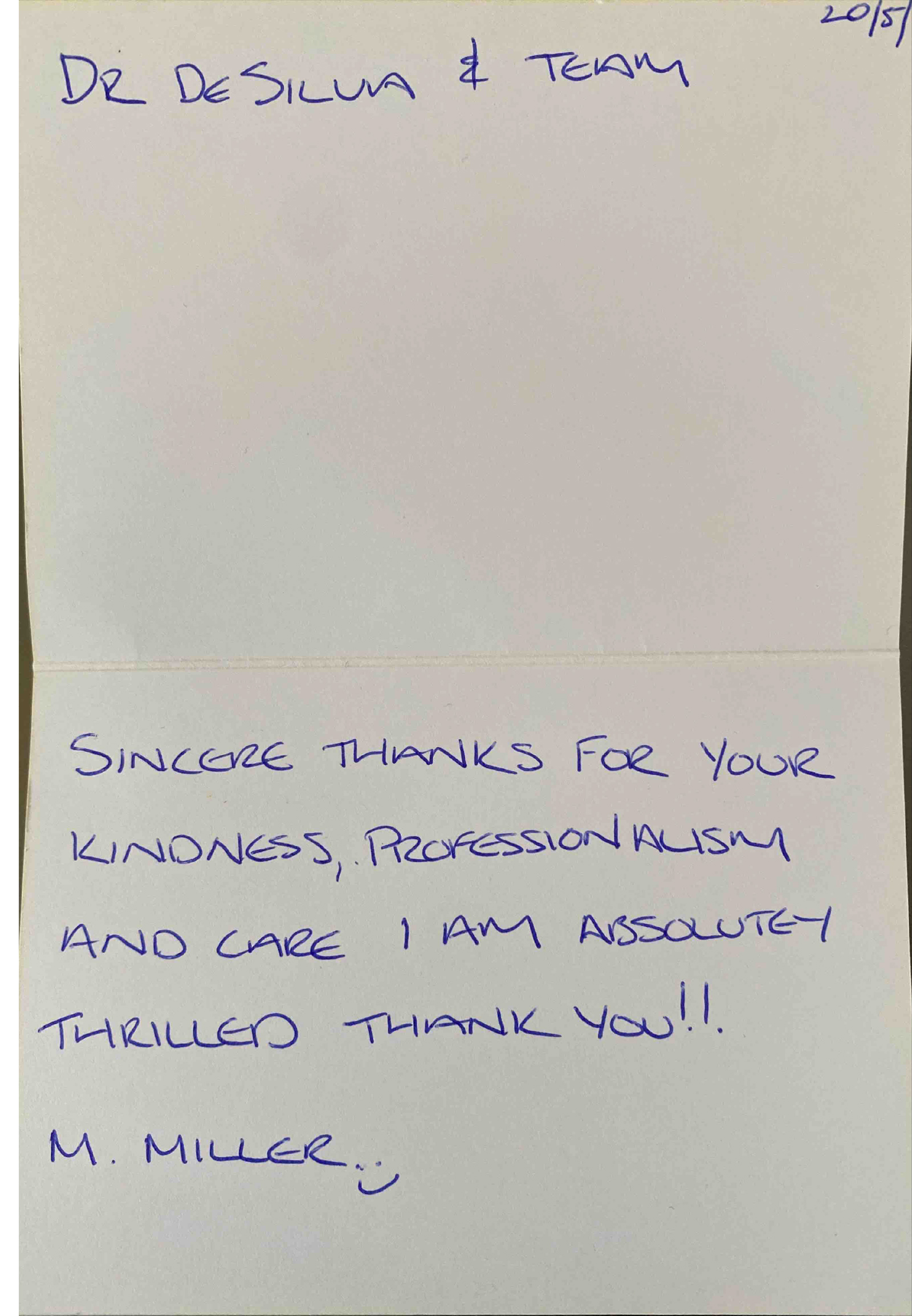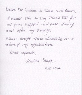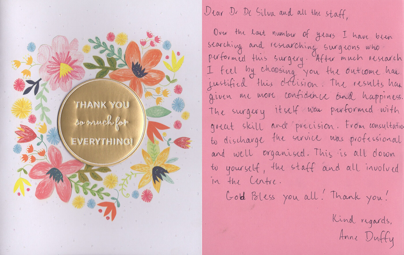 “I was very impressed with Dr De Silva’s surgical and anaesthetic care, thank you.”