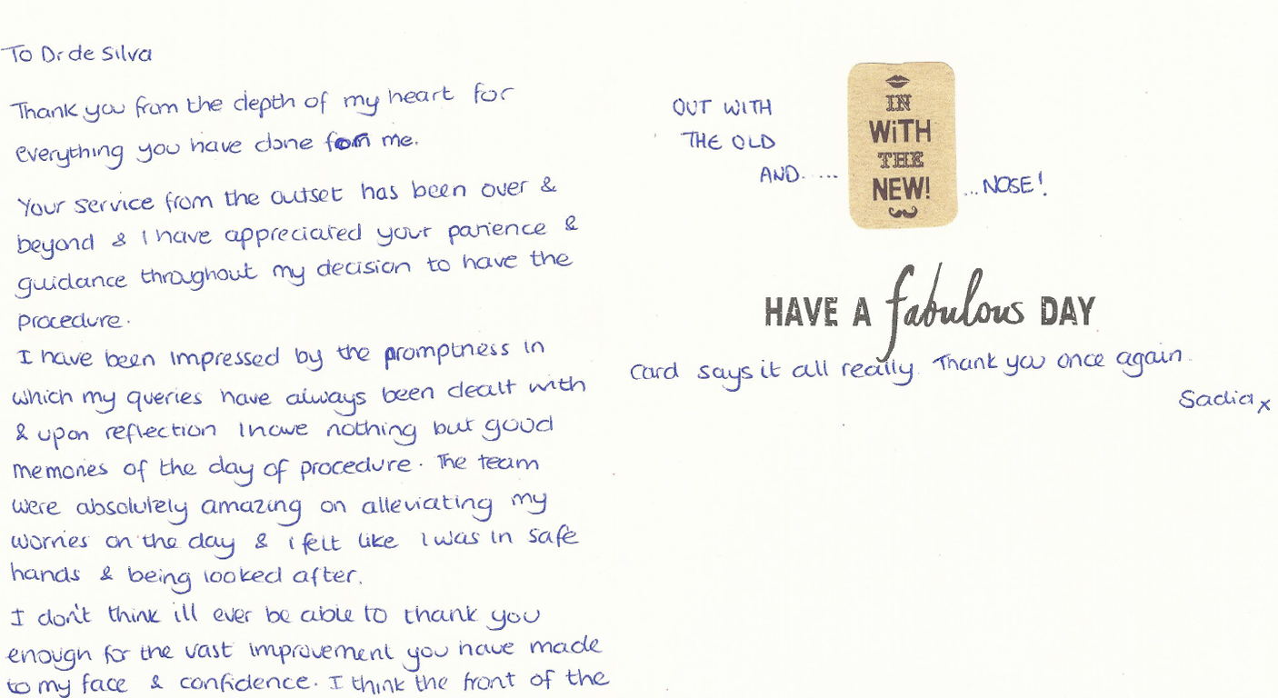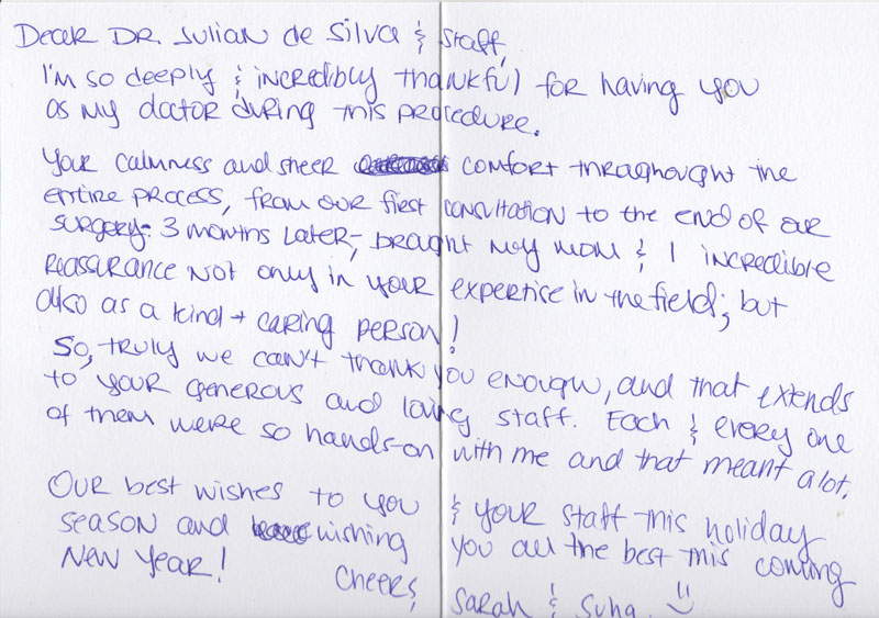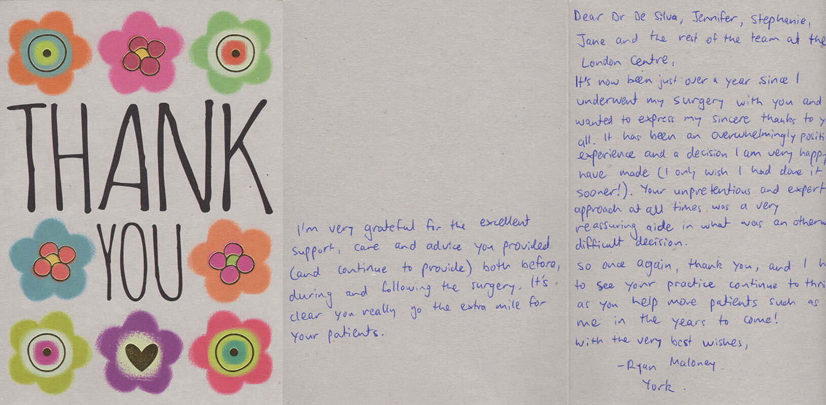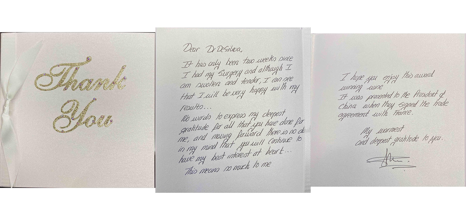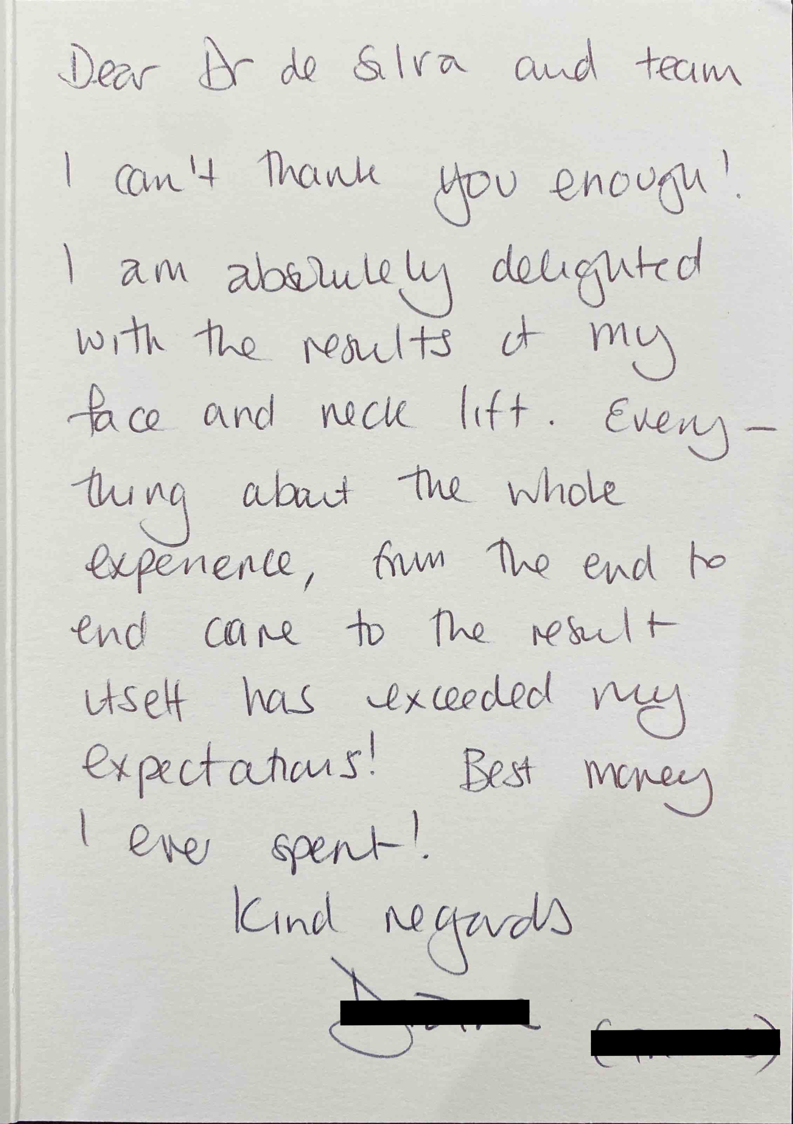 “I was very impressed with Dr De Silva’s surgical and anaesthetic care, thank you.”