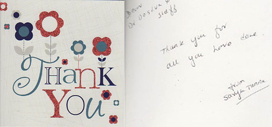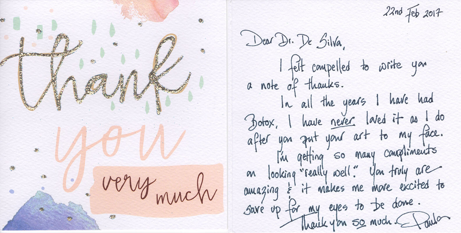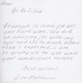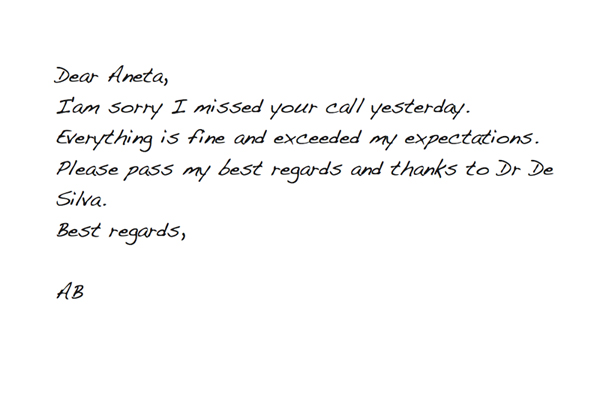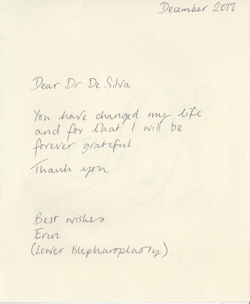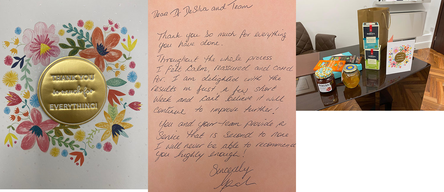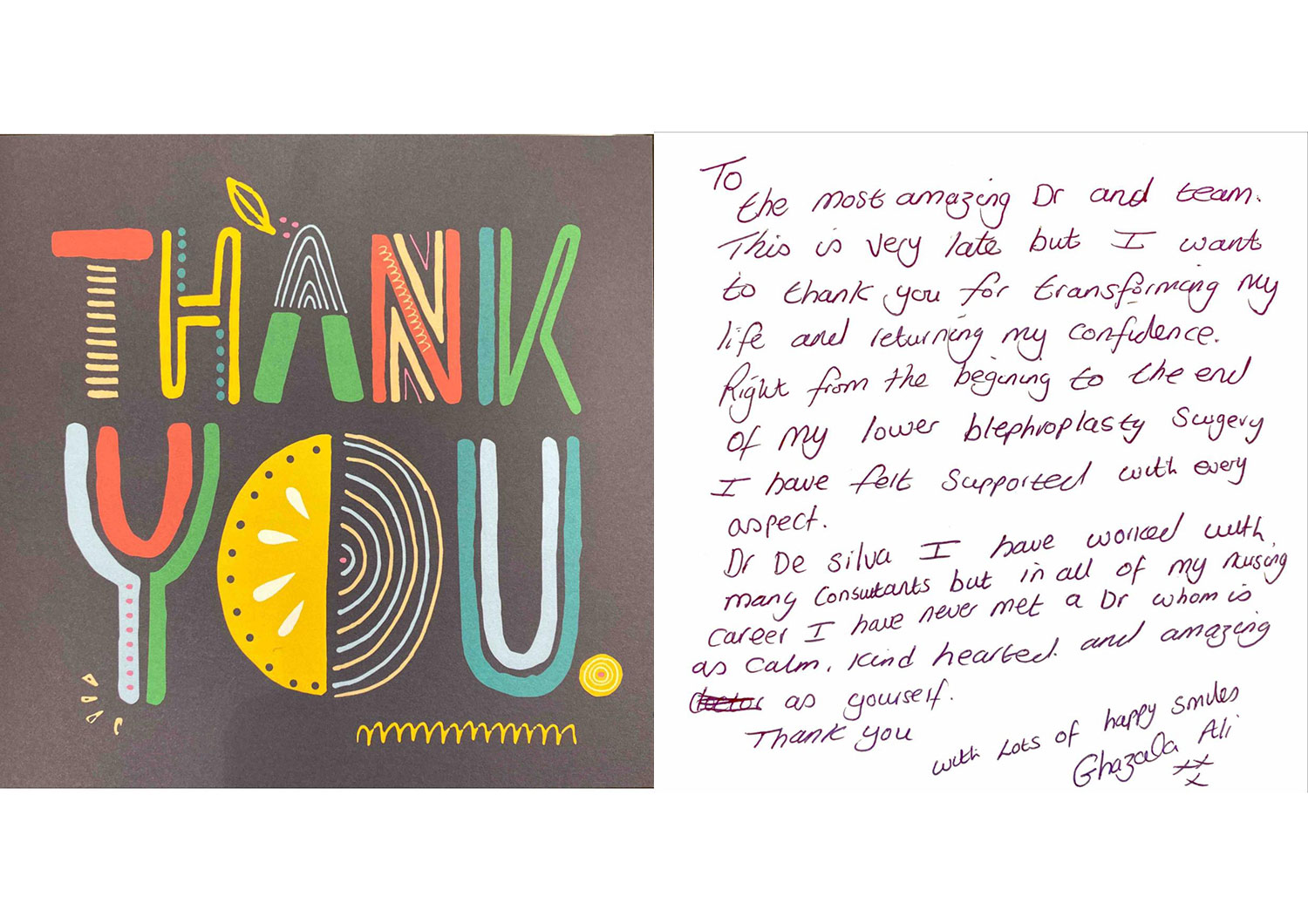 “Dear Mr. De Silva, Thank you very much for your careful examination of my ageing eyes yesterday and for your advice about how to tackle my aging eyes. Armed with my eye drops, ointment, flannel, cotton wool, buds and pills I’m following your guidance as carefully as I can. Thank you for going to so much trouble on my behalf. I’m very grateful to you and to your team for treating my small problems with much care and efficiency. With best wishes.”