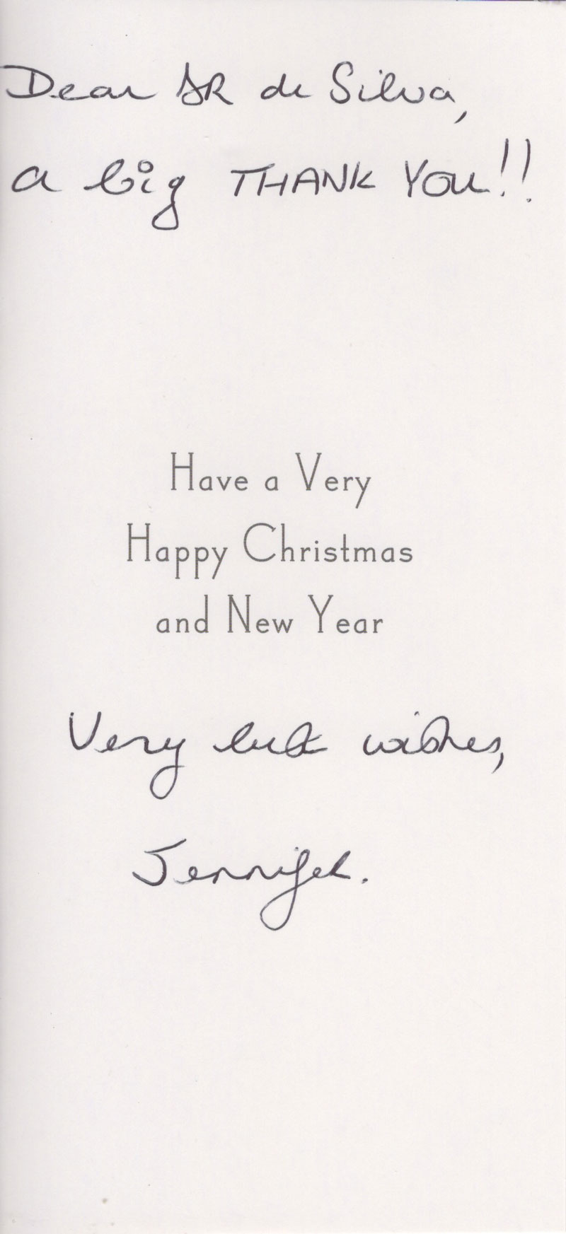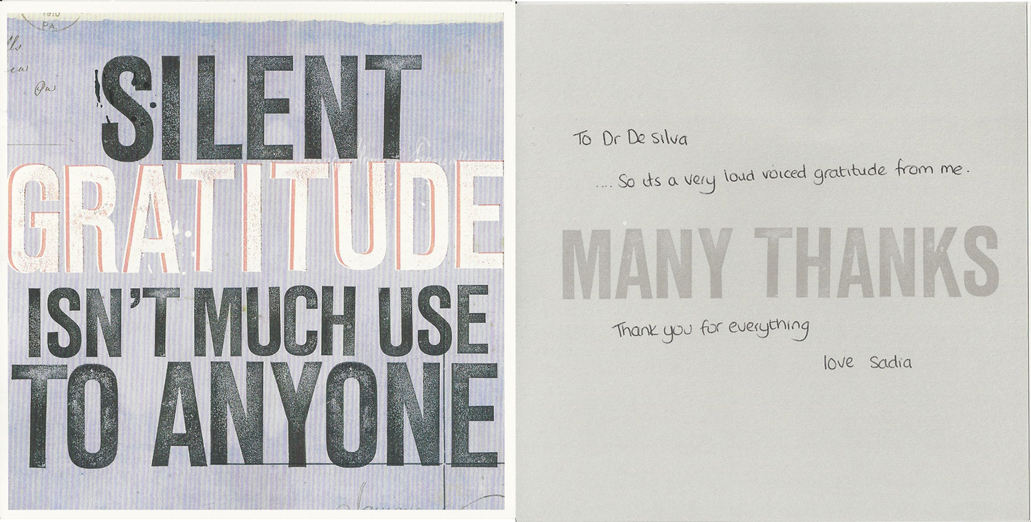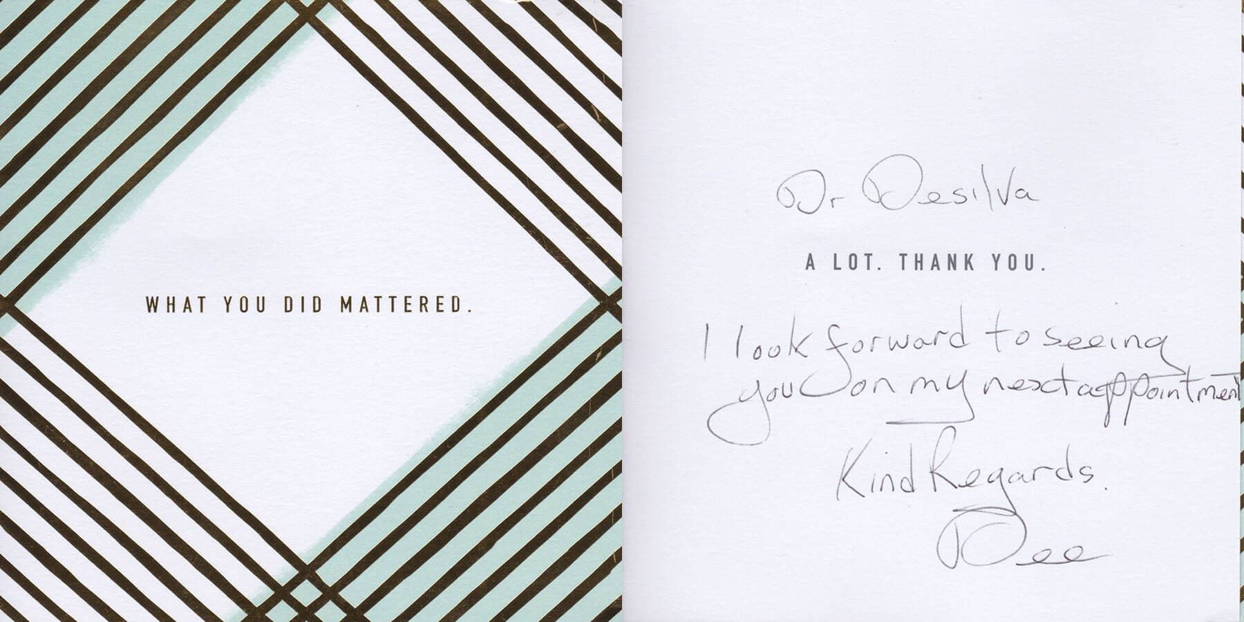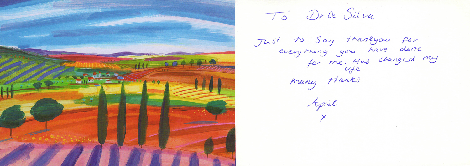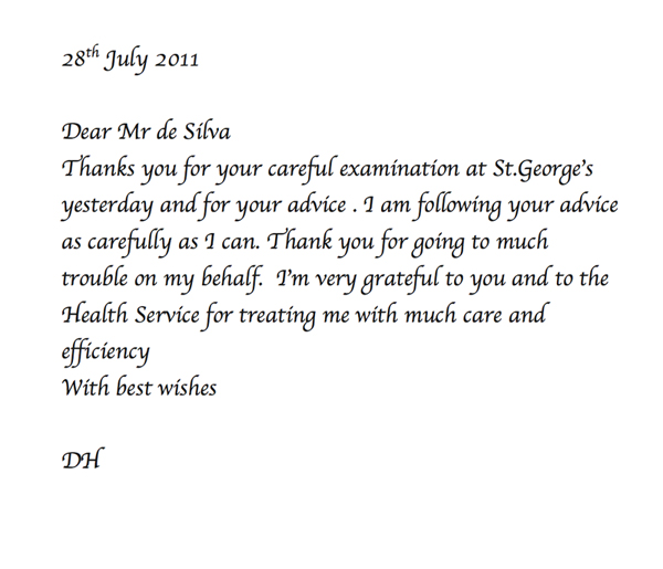 “Dear Mr. De Silva, Thank you very much for your careful examination of my ageing eyes yesterday and for your advice about how to tackle my aging eyes. Armed with my eye drops, ointment, flannel, cotton wool, buds and pills I’m following your guidance as carefully as I can. Thank you for going to so much trouble on my behalf. I’m very grateful to you and to your team for treating my small problems with much care and efficiency. With best wishes.”