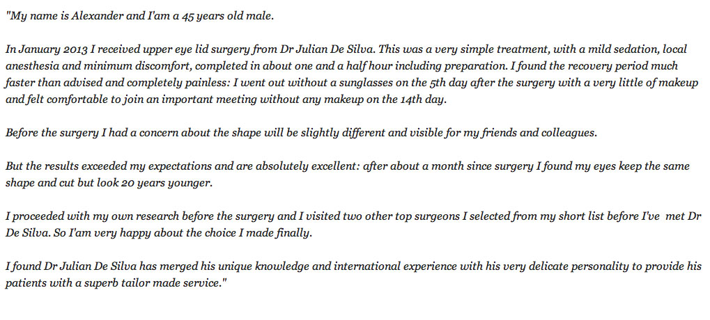 In January 2013 I received upper eye lid surgery from Dr Julian De Silva. This was a very simple treatment, with a mild sedation, local anesthesia and minimum discomfort, completed in about one and a half hour including preparation. I found the recovery period much faster than advised and completely painless: I went out without a sunglasses on the 5th day after the surgery with a very little of makeup and felt comfortable to join an important meeting without any makeup on the 14th day.