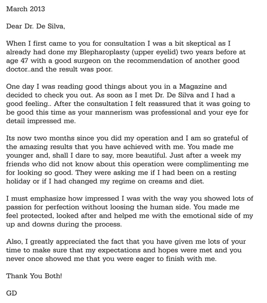 I was very happy with the results of my upper and lower lid blepharoplasty, anti-wrinkle injections and fat augmentation in February 2013. Dr De Silva and his team were very thoughtful and professional and took great care with reassurance and good communication before and after the operation which I had under mild sedation and local anesthesia. There was no pain and with the clearly written and explained instructions for post-op, I made a speedy recovery.