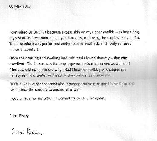 If you are considering having eye-lid surgery my advice would be to use Dr De Silva. You could not be in better hands. I would not hesitate to use him again.