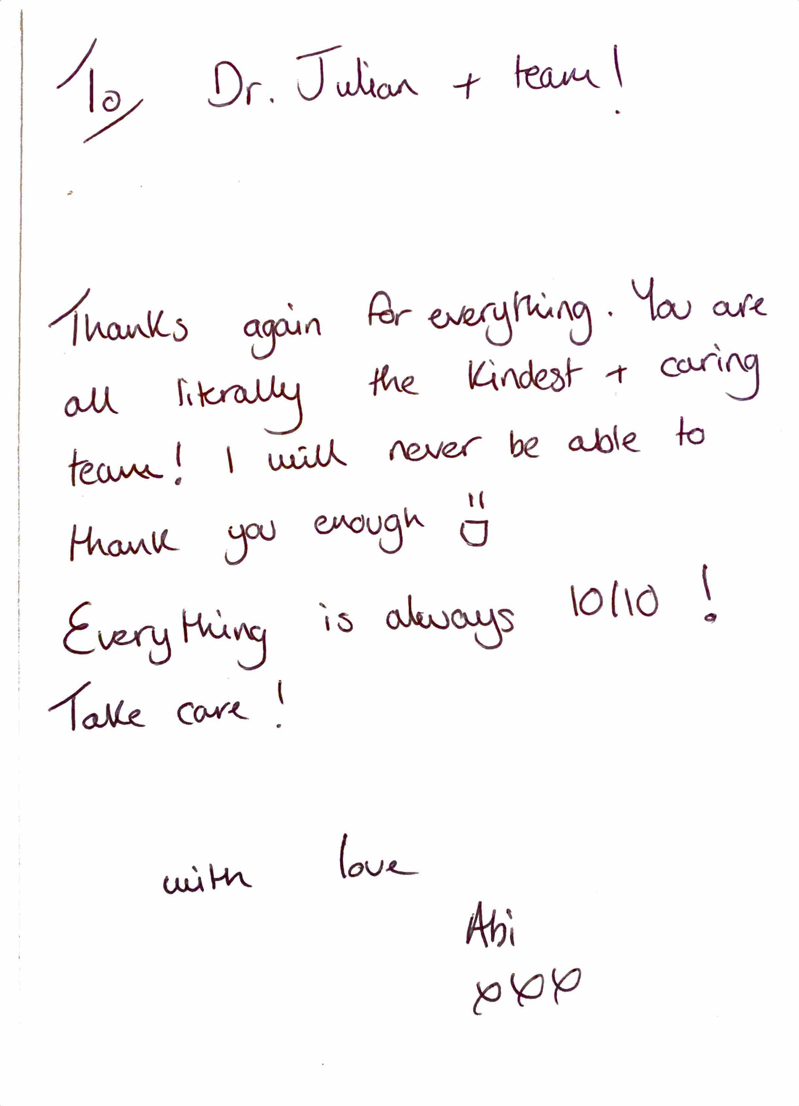 Just wanted to say a thank to Dr Julian, Very kind man & honest in his approach, seems like an inspiring figure for young people affiliated with science medicine & surgical procedures, Im grateful to the time that he did spend & attention he gave to my concern.