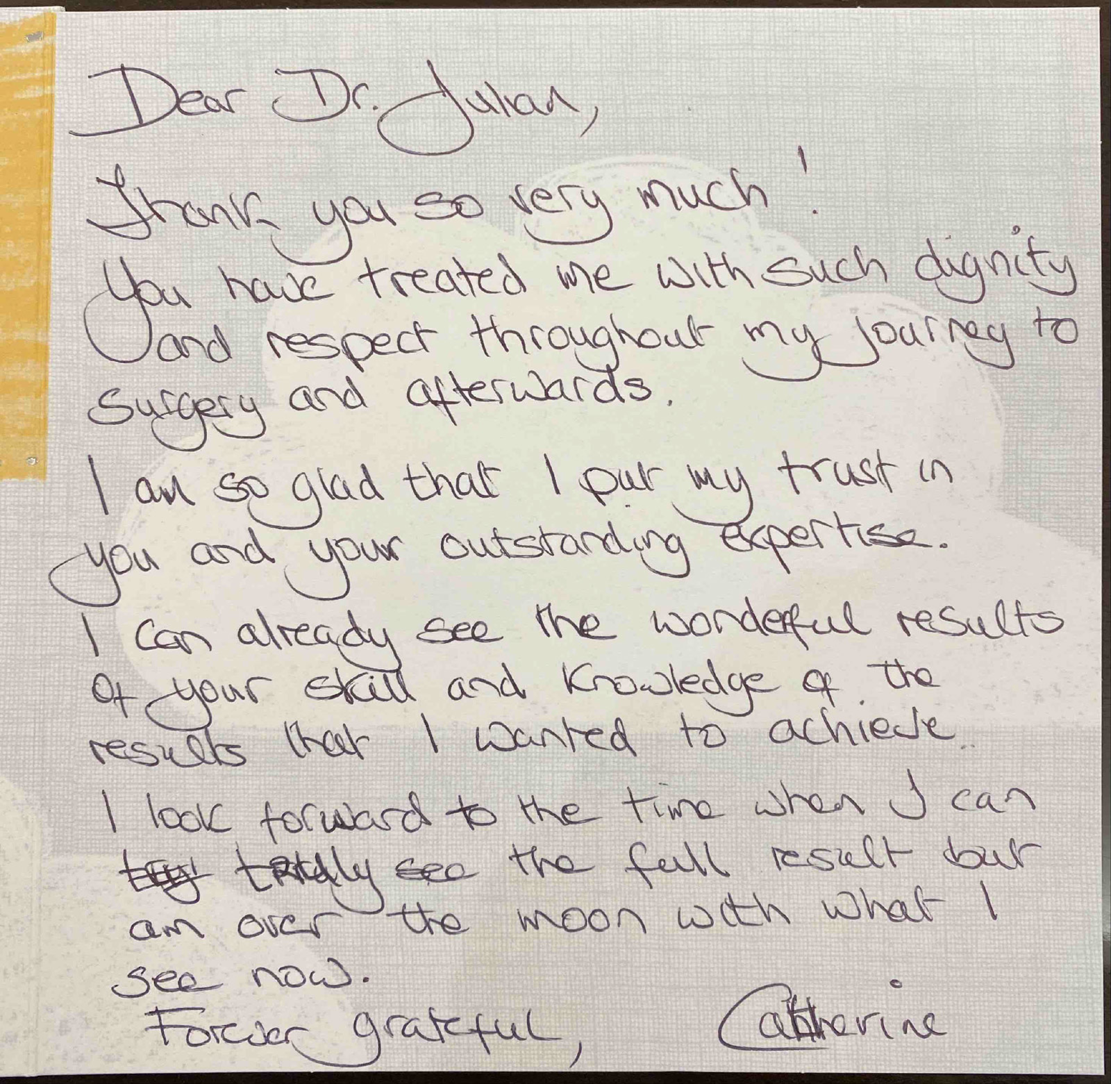 It is truly difficult to find the words to fully express my happiness and excitement since my surgery last week. The outstanding care and kindness shown to me from my first consultation till aftercare is by far beyond my expectation. Never have I met such a remarkable doctor and team of professionals. It is evident that you all enjoy what you do and I cannot thank or praise you all enough.