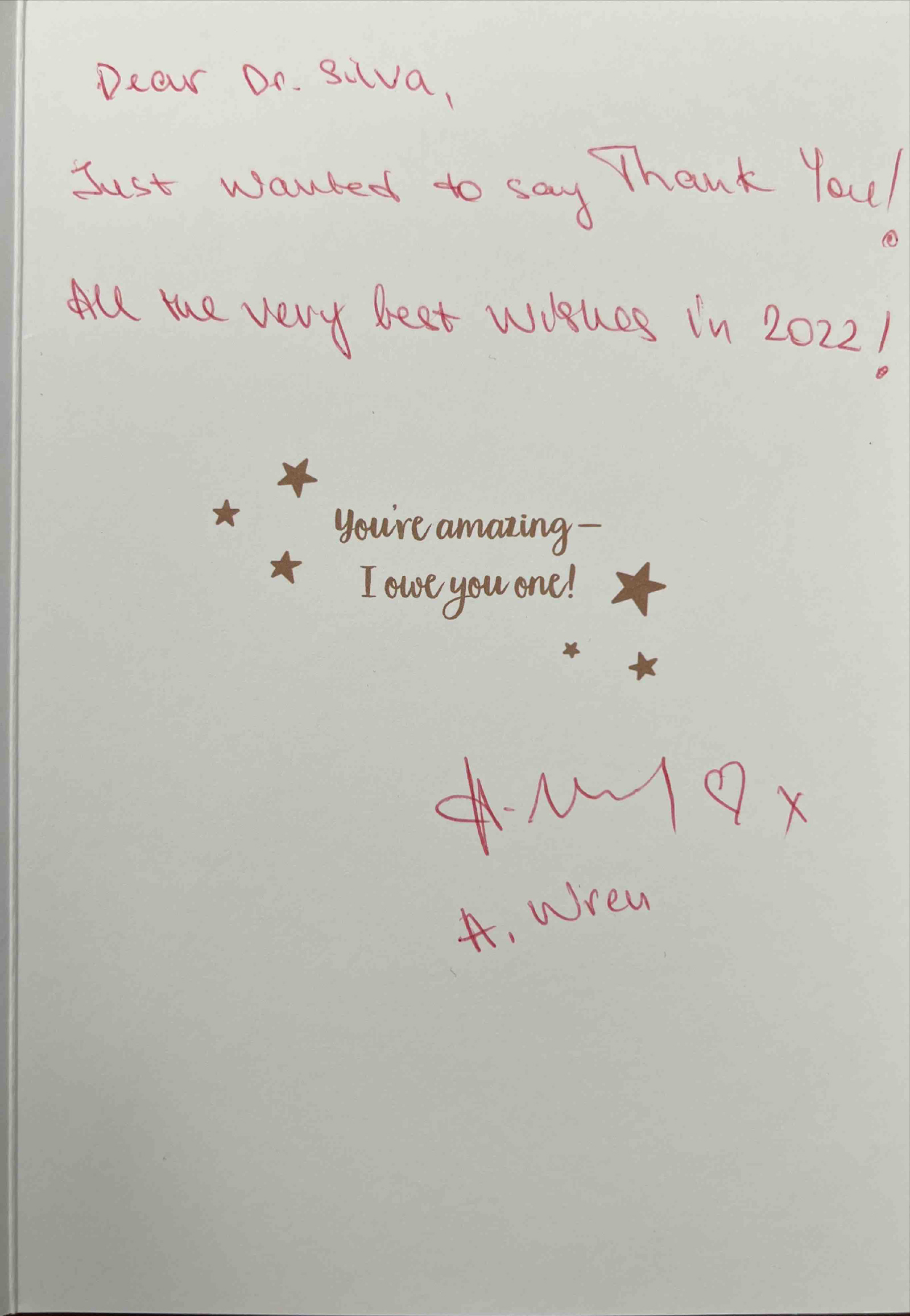 “Hi Dr De Silva I just wanted to give you an update on how I am doing.