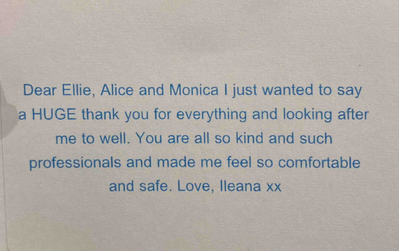 “Just to say how amazing my care was from start to finish. It made the whole procedure less stressful and I felt completely well looked after from start to finish. I can’t thank you enough!!”